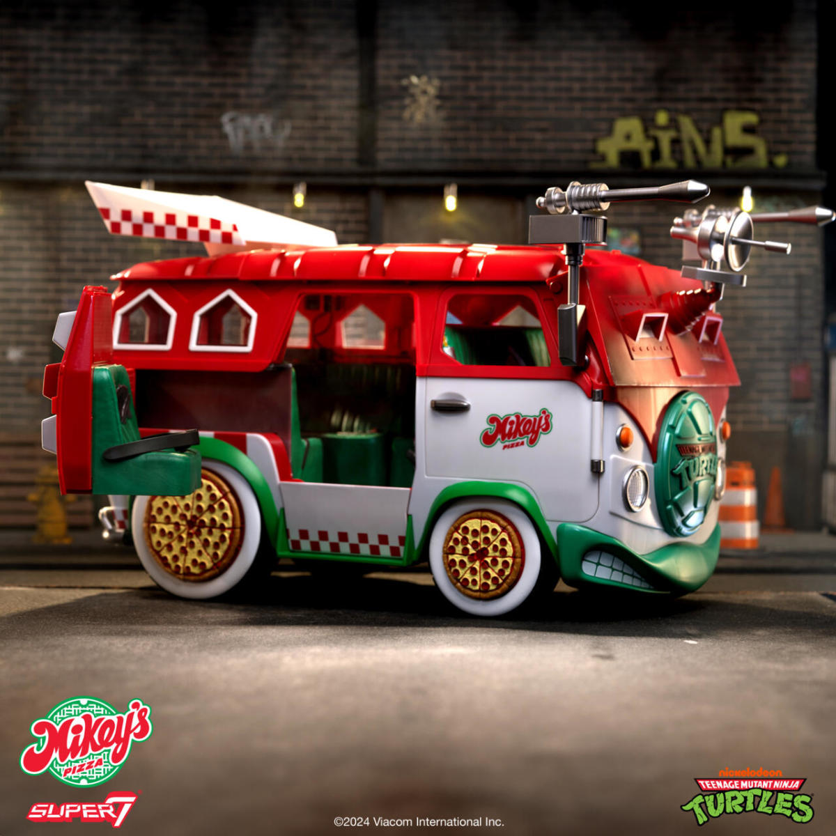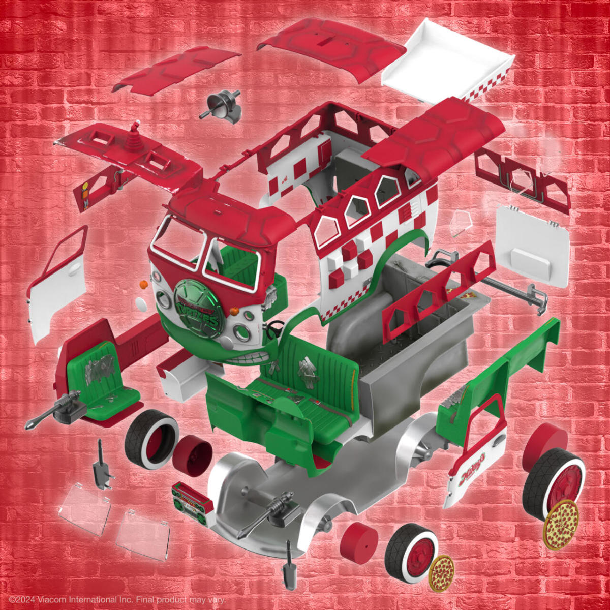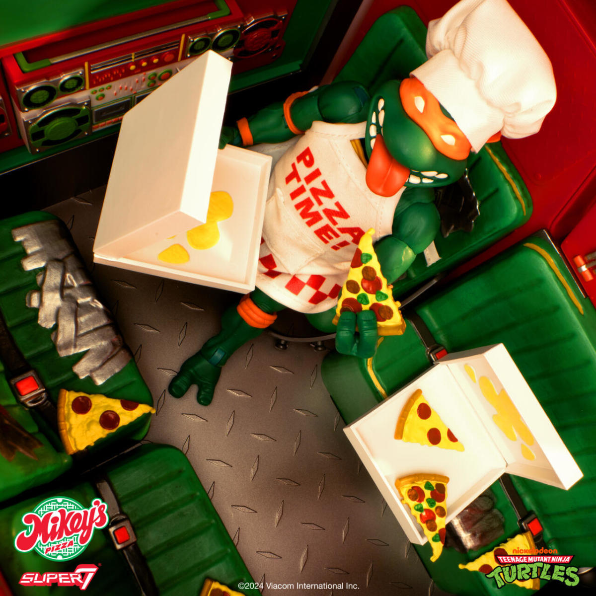本次的「披薩派對烏龜車」以 2022 年採 Made-To-Order 形式發售的「烏龜車」載具模型為基底改造,雖然當時 450 美元的售價受到不少玩家的反彈,但實際出貨後買家的回饋相當的不錯,是充滿了細節及彩蛋,且實際能夠收納多隻忍者龜 7 吋可動人偶,並在內部擺設各種動態、接近場景的載具模型!這次推出的版本將經典黃綠配色的烏龜車身改造為義大利國旗紅白綠配色的披薩外送車,並在車門上印上了披薩和上常見的雙色方塊條紋以及「Mikey's Pizza」LOGO,內部充滿細節塗裝的座椅及內裝從原先的橘色改為綠色,四個輪胎也製作成了能夠裝上配件變成披薩造型的設計,有趣的外型及改造非常貼合本次的披薩主題!