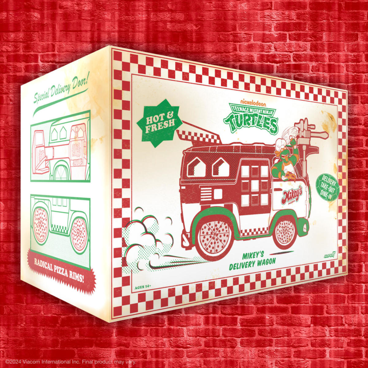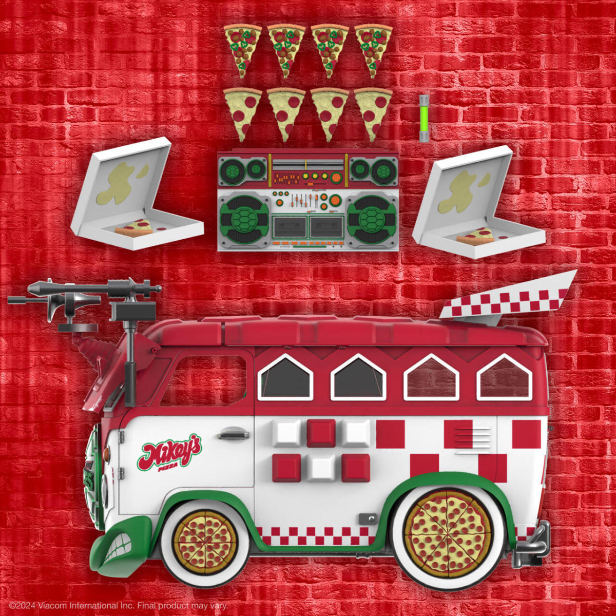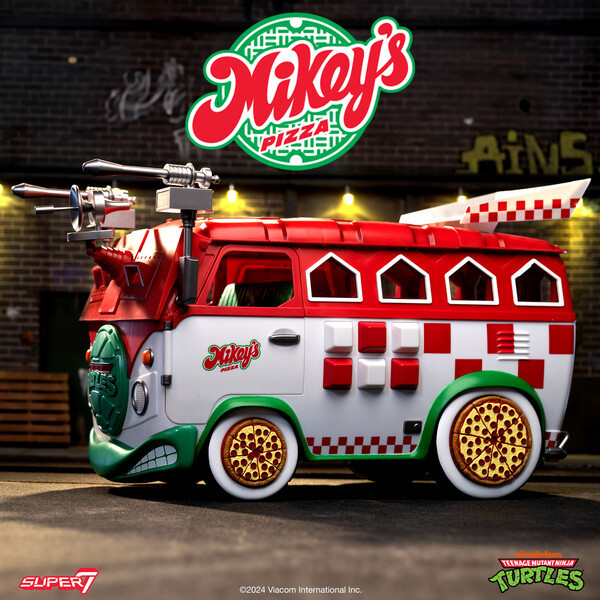 本次的「披薩派對烏龜車」以 2022 年採 Made-To-Order 形式發售的「烏龜車」載具模型為基底改造,雖然當時 450 美元的售價受到不少玩家的反彈,但實際出貨後買家的回饋相當的不錯,是充滿了細節及彩蛋,且實際能夠收納多隻忍者龜 7 吋可動人偶,並在內部擺設各種動態、接近場景的載具模型!這次推出的版本將經典黃綠配色的烏龜車身改造為義大利國旗紅白綠配色的披薩外送車,並在車門上印上了披薩和上常見的雙色方塊條紋以及「Mikey's Pizza」LOGO,內部充滿細節塗裝的座椅及內裝從原先的橘色改為綠色,四個輪胎也製作成了能夠裝上配件變成披薩造型的設計,有趣的外型及改造非常貼合本次的披薩主題!