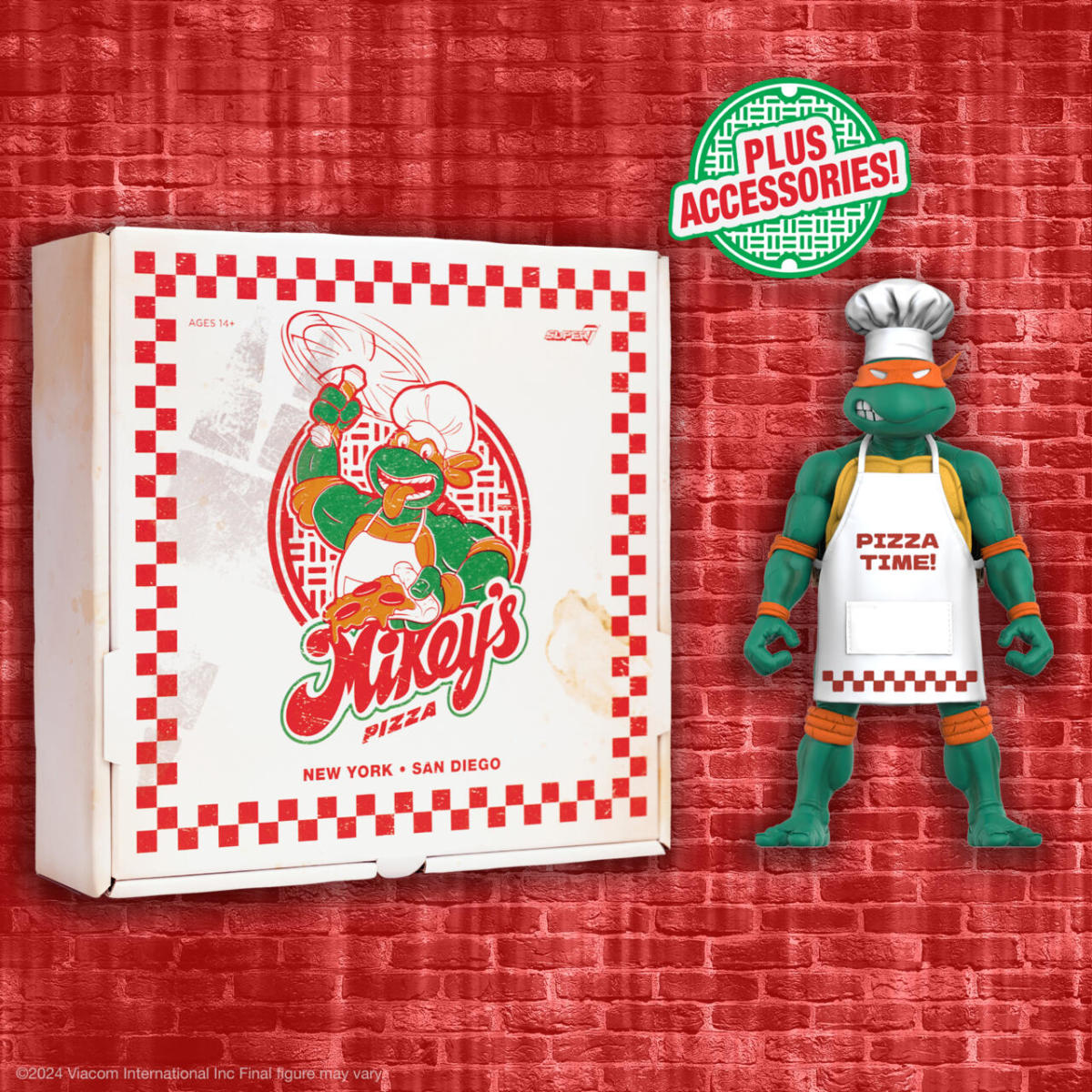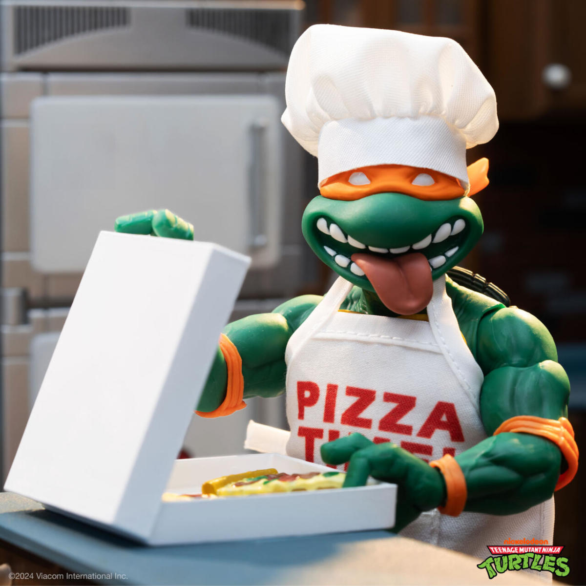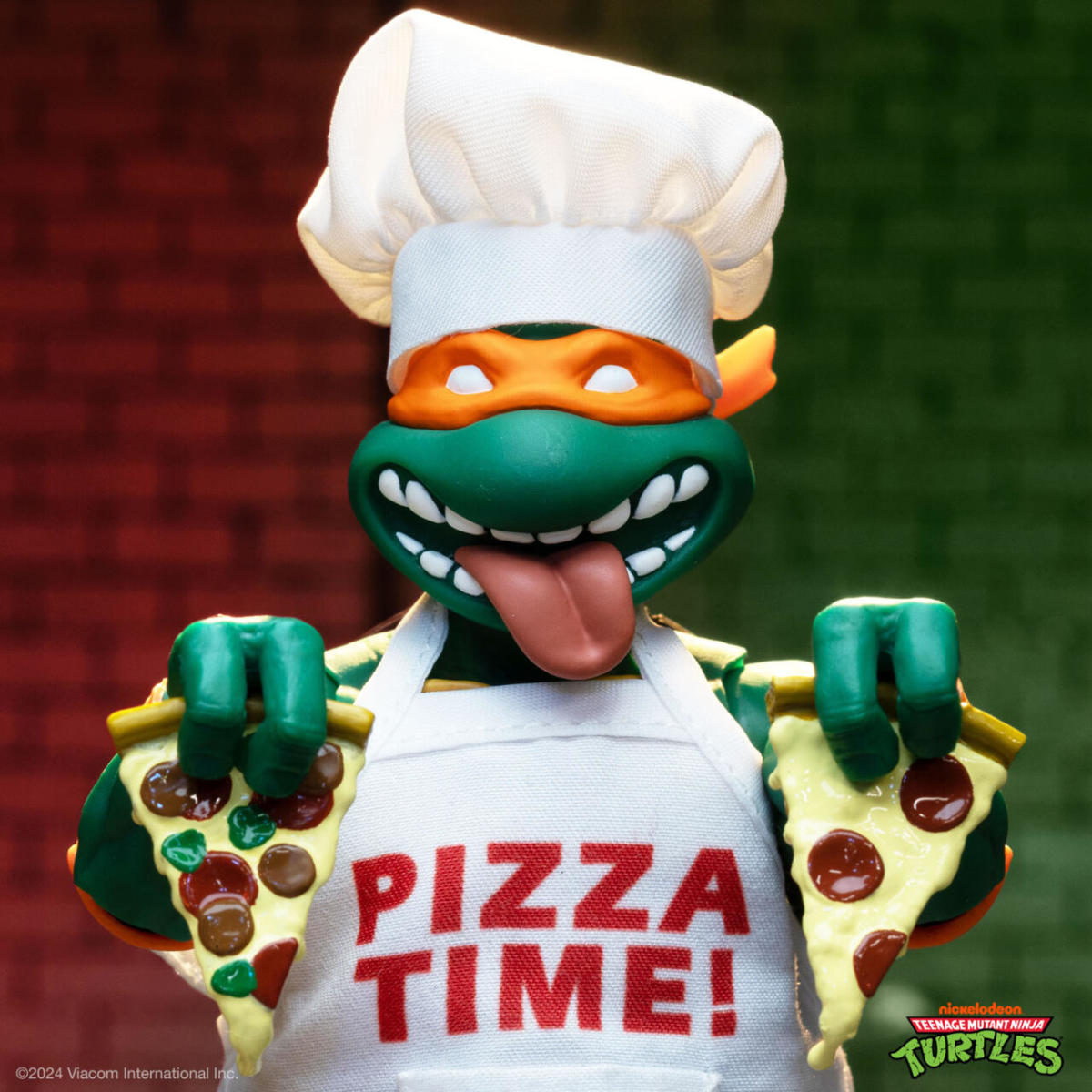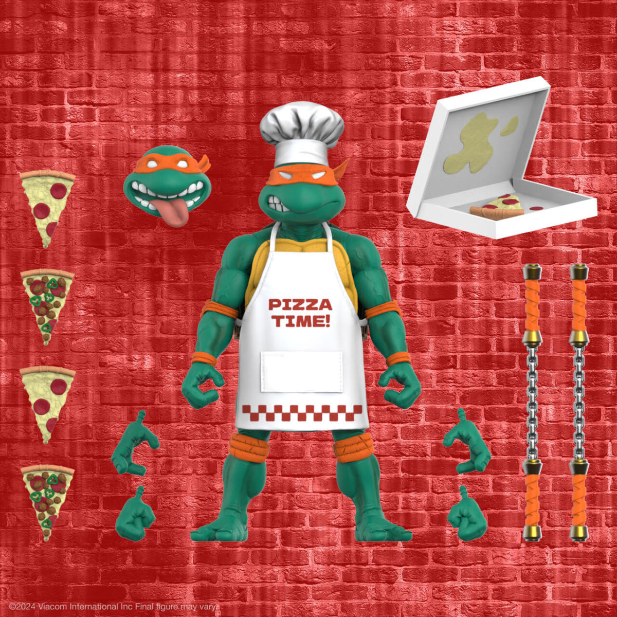 這次的商品披薩大廚米奇是以先前在 ULTIMATES! 忍者龜系列第三波推出的「米開朗基羅」7 吋可動人偶為基底改造,為他製作了印有「Pizza Time」字樣的布面圍裙以及廚師高帽,呈現出他在廚房做披薩時的打扮!配件部分同樣附有米開朗基羅專屬的武器雙節棍,以四片披薩和一個披薩盒取代了第三波推出時致敬彩星版的經典武器套件,並收錄了第六波推出的「下水道衝浪手米奇」俏皮的吐舌頭頭雕,搭配一同推出的「披薩派對烏龜車」可以擺設出大廚米奇在餐車裡偷吃披薩的有趣場景!