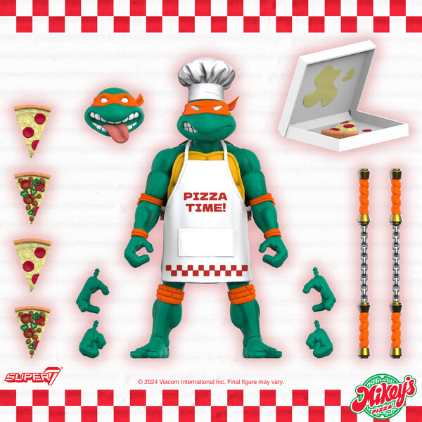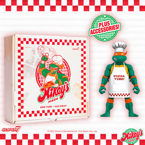 致力於推出 8、90 年代流行文化主題玩具的美系玩具廠牌 SUPER7 公開了一系列即將在聖地牙哥動漫展(San Diego Comic Con,簡稱 SDCC)快閃活動「米奇的披薩」(Mikey's Pizza)推出的忍者龜主題商品!首先要帶各位玩具人看到的是在 SUPER7 旗下的可動人偶「ULTIMATES!」系列推出的「披薩大廚米奇」(Pizza Chef Mikey)7 吋可動人偶!