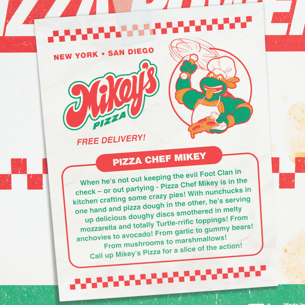 如果說四隻熱愛披薩的烏龜中誰最有可能開披薩店,那絕對就是對披薩癡狂的米開朗基羅了! SUPER7 本次在聖地牙哥的在地披薩店「TNT Pizza」舉辦快閃活動「米奇的披薩」,設定為披薩狂熱者米開朗基羅開了一間自己的披薩店,推出多款以披薩為主題的新商品!