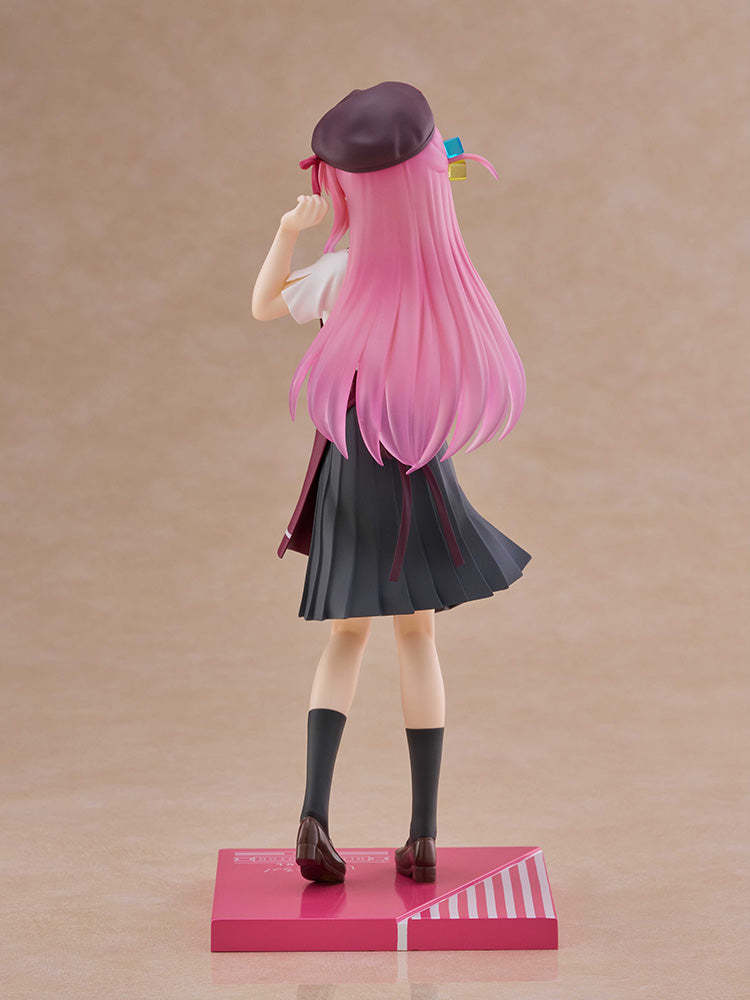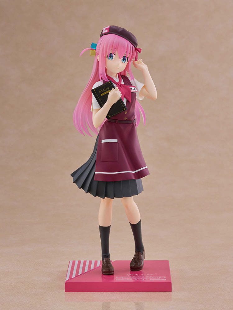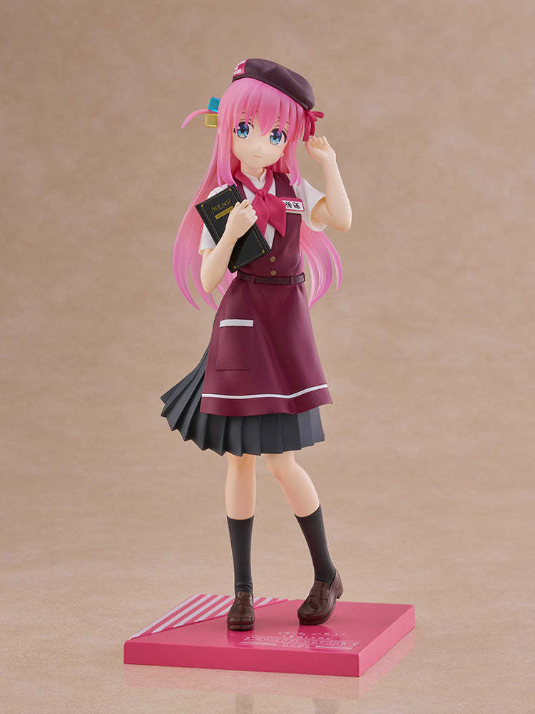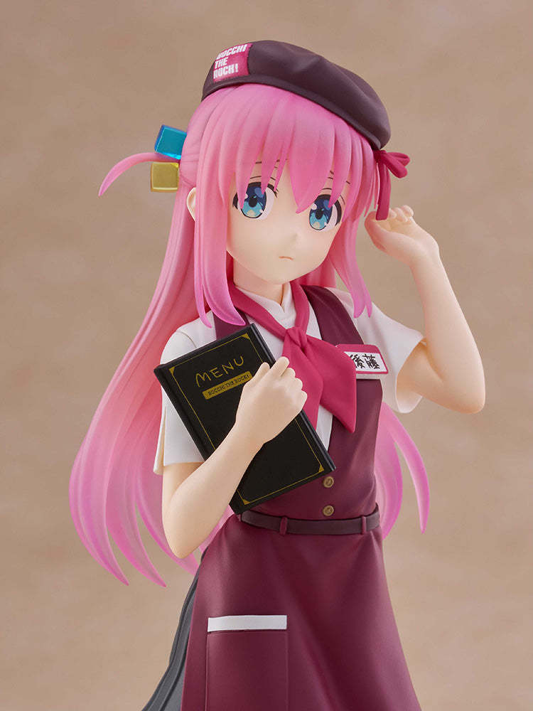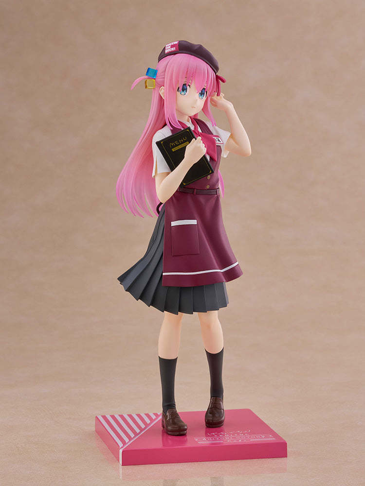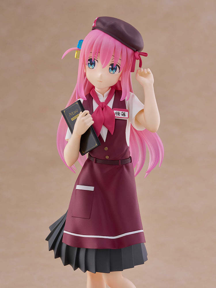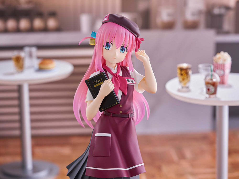 本次的「後藤一里 咖啡廳風格ver.」全高約 20 公分,為小孤獨打造原創的咖啡廳店員造型,略微移開的視線和輕輕彎曲的左手腳姿勢,搭配有些困擾的神情呈現出小孤獨做服務業充滿不安的感覺!服裝部分以同色系的圍裙、貝雷帽、蝴蝶結和圍巾搭配而成,頭髮部分則是以透明材質打造出剔透的視覺效果,整體看起來非常輕盈可愛!