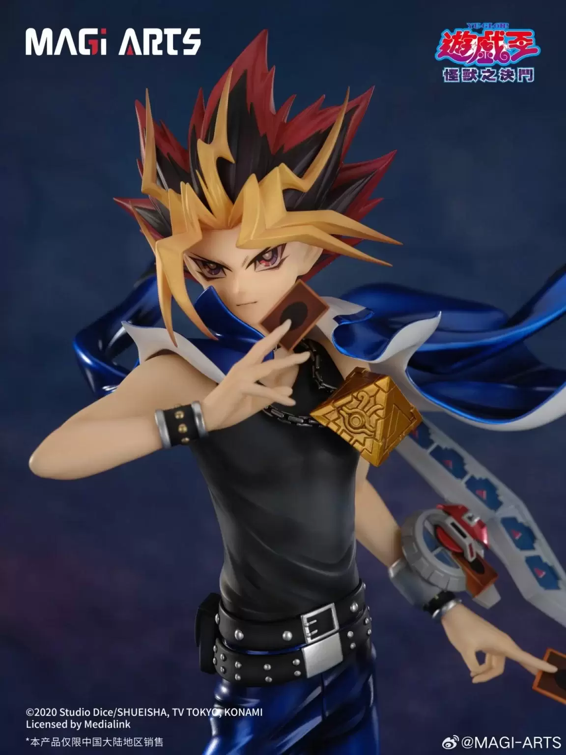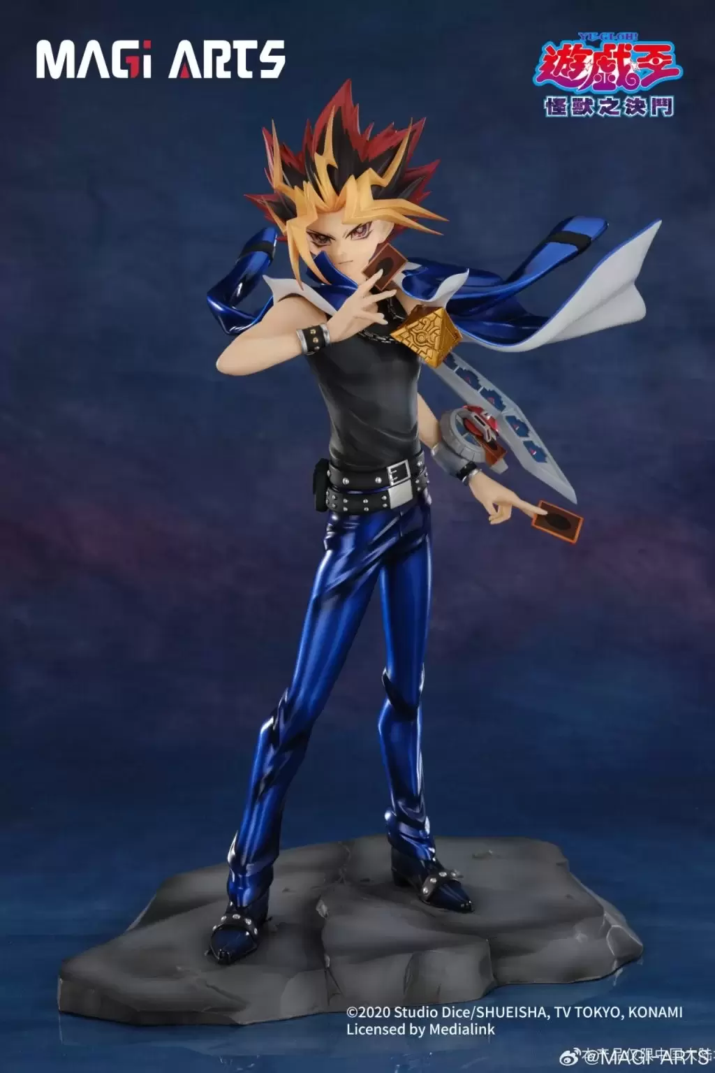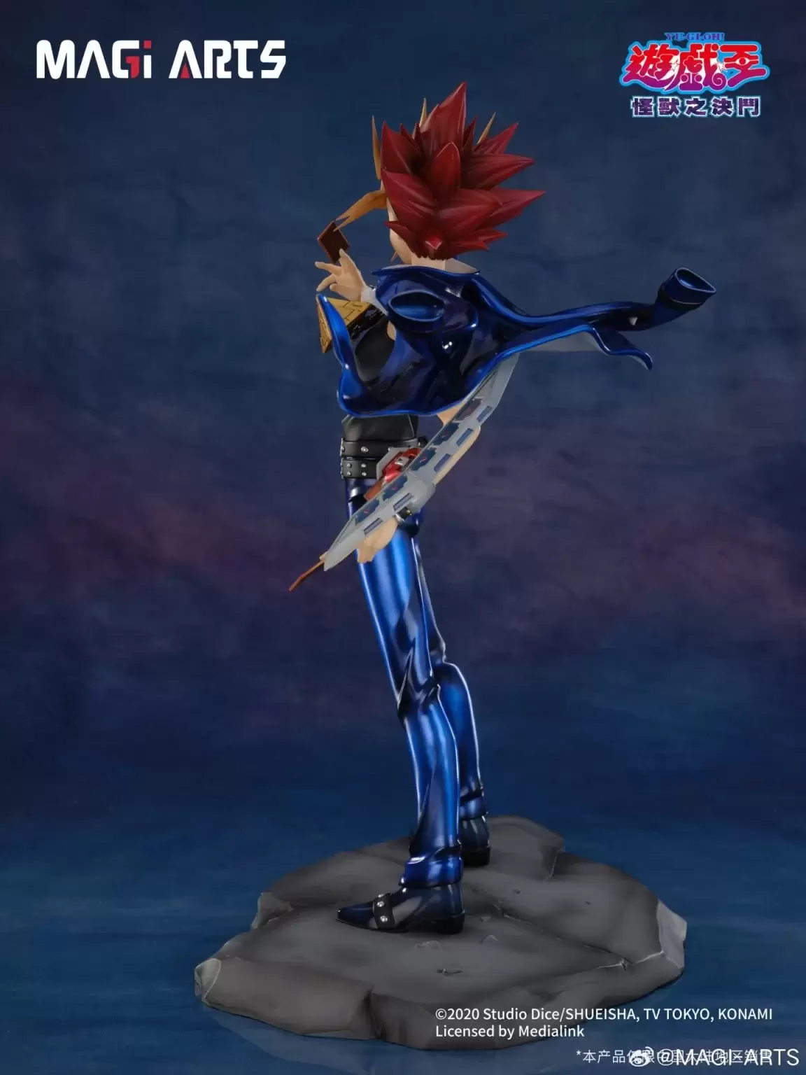 「MAGI ARTS 武藤遊戲」1/6比例模型,與中國繪師 Ekita玄合作,將筆下充滿個人風格的遊戲插畫立體化!尺寸全高約 29 公分,生動表現出遊戲準備以戰鬥怪獸卡決鬥的魄力身姿!經典的中二海星頭與金色瀏海刻劃了髮束的細節,向著身後強烈舞動的外套、線條銳利的長褲、脖子上的千年積木與極具存在感的腰帶等角色特色考究還原,採用耐黃變高光澤的UV光油和膚色手感塗裝,打造出更精緻的質感。