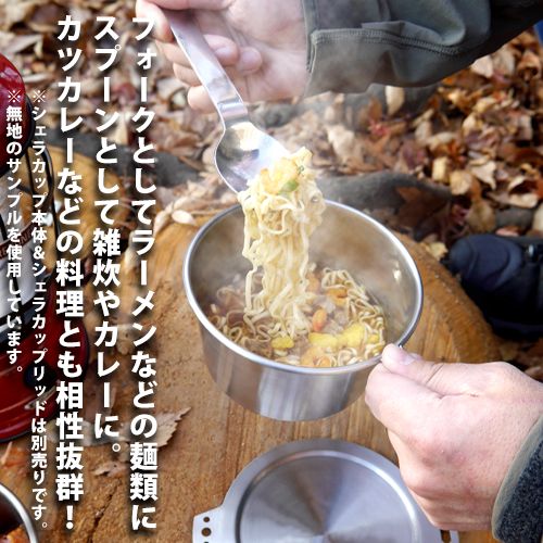 大小約為 320 ml,亦有人稱它為碗杯,是因為它既能當碗,也能當杯子。一物能多用,再加上其中有針對戶外活動考量的特別設計,是露營炊事進食時不可或缺的好幫手。將 Q 版的四人用餐圖案印製在碗底,簡單可愛又實用。