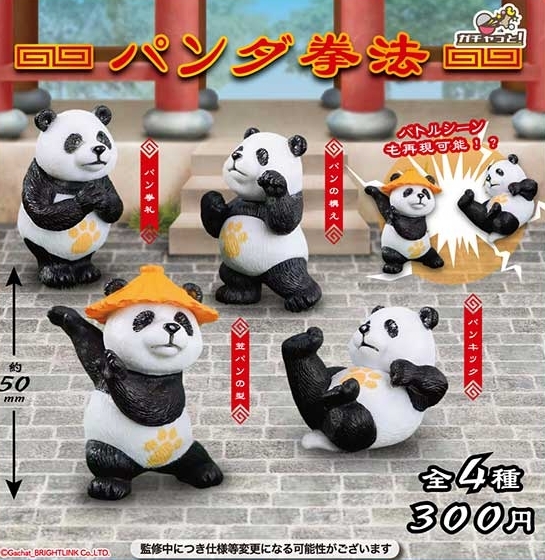 「熊貓拳法」轉蛋以熊貓為主題,熊貓的肚肚上都印有像是證明是同門師兄弟一樣的一個熊貓掌印印記,並為每隻熊貓擺設出各種有趣的武打造型,共收錄「熊貓拳禮」、「熊貓預備勢」、「斗笠熊貓」以及「熊貓飛踢」四種款式,在每款約 5 公分的大小下細緻的雕刻出熊貓們認真展示自己武功的可愛模樣,其中斗笠熊貓和熊貓飛踢對擺甚至可以擺設出像是對打的場面!