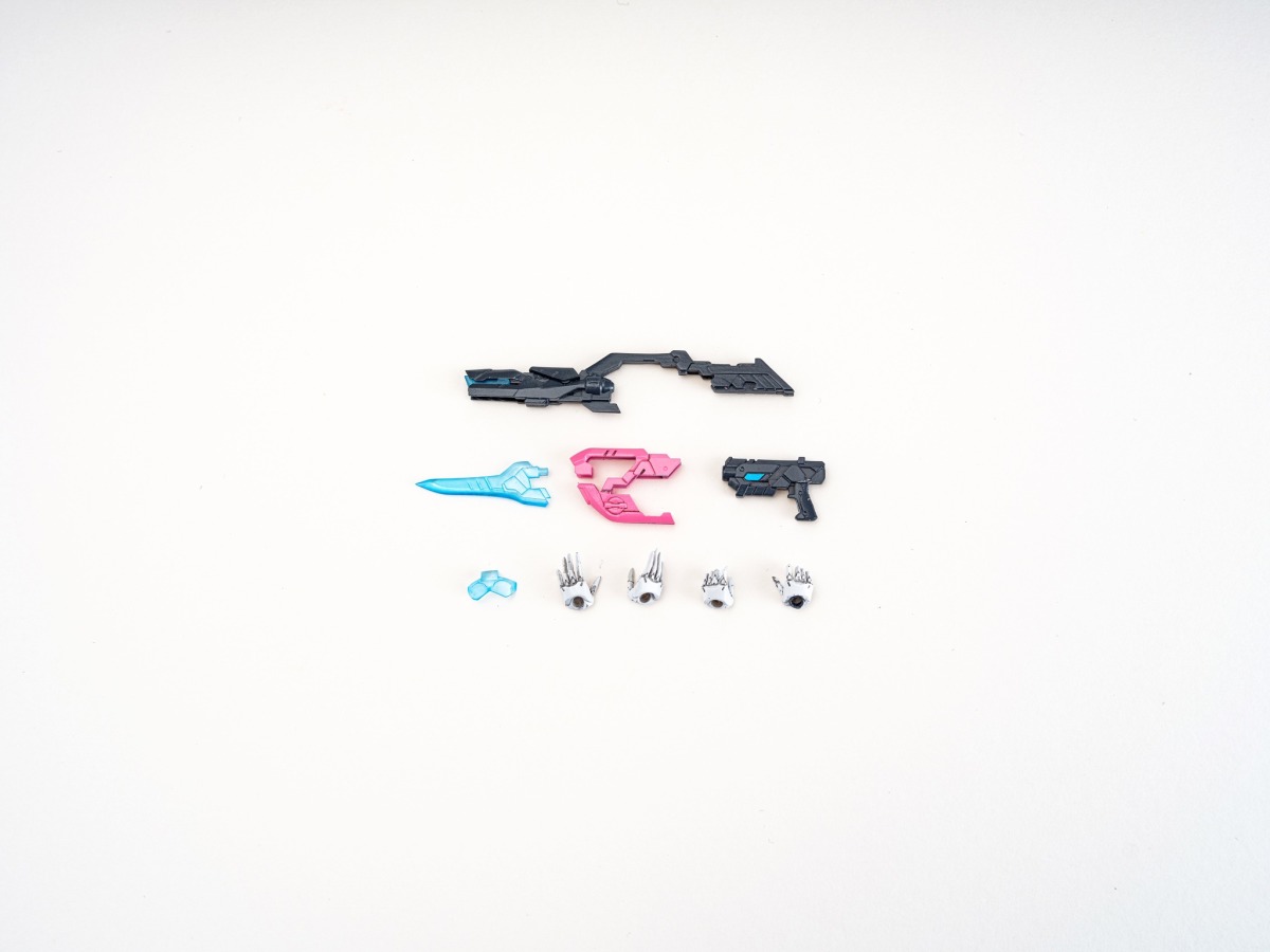 武器附上以爆能手槍為主的多種可組合零件,充分還原雅希近身遠程都拿手的全能戰鬥風格,還有額外的替換手零件。