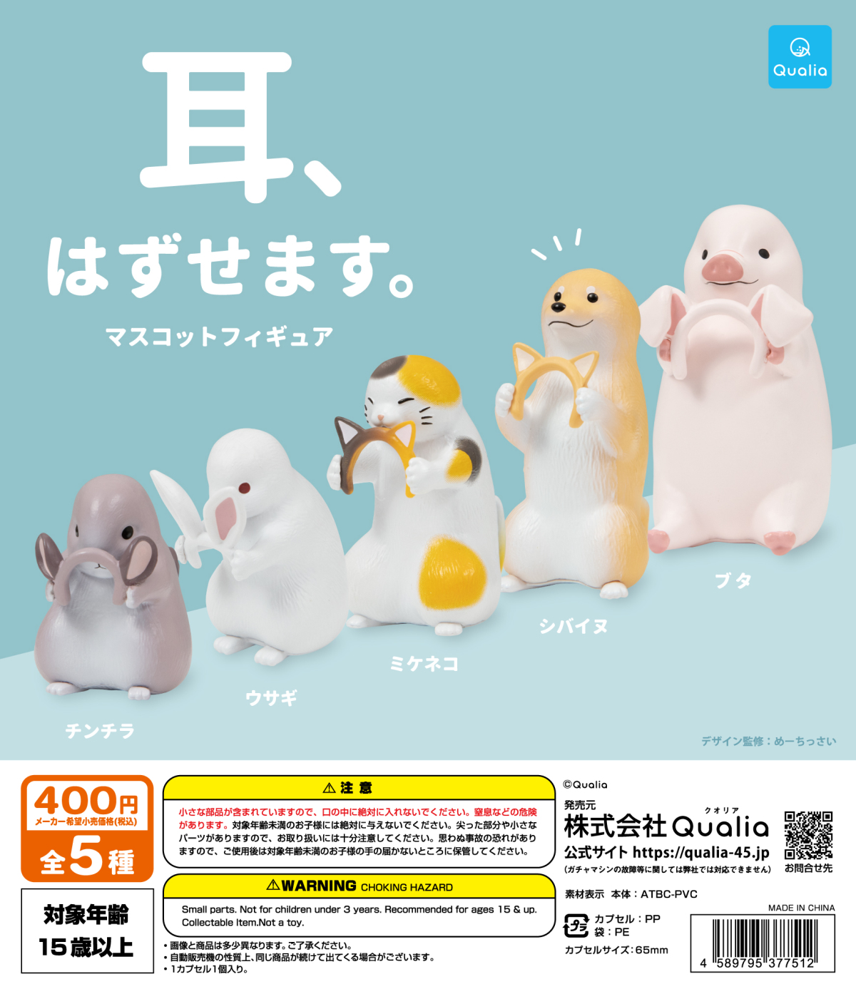 Qualia「可以拔掉耳朵」轉蛋,表現出人氣動物不為人知的一面...原來動物們的耳朵只是裝飾?將耳朵設計成髮箍的造型,拿下耳朵的長尾毛絲鼠、兔兔、貓、柴犬、小豬,頭頂變得圓潤光禿,既搞笑又可愛!要是可以把耳朵髮箍換到其他動物頭上就更讚了~