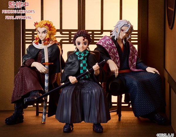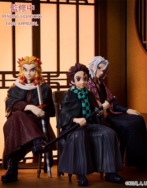 以動畫製作公司 Ufotable 繪製的插畫服裝為基礎,將「竈門炭治郎、煉獄杏壽郎、宇髄天元」立體化為無比例模型。雖然不是按比例製作,但非常注重細節,在衣服的布料、布紋雕刻出逼真的質感,整體呈現較放鬆的氛圍,與穿著鬼殺隊服時的感覺完全不同~皆採用坐姿呈現,可以坐在架子、桌子等其他任何地方;附有一把別緻的椅子,形狀與衣服氛圍相匹配!
