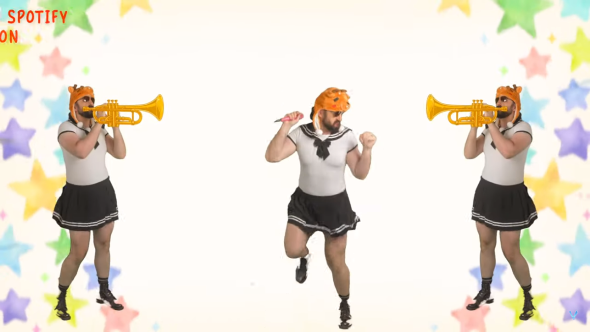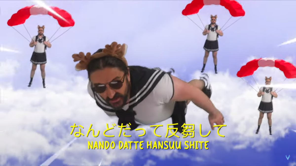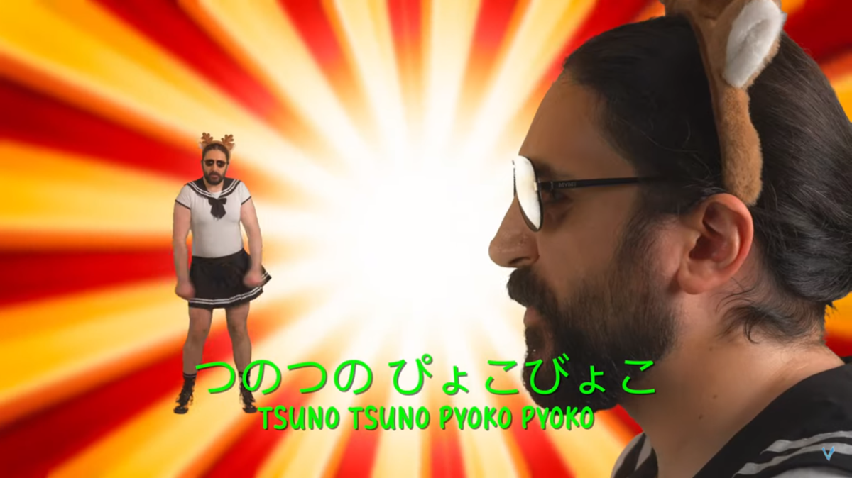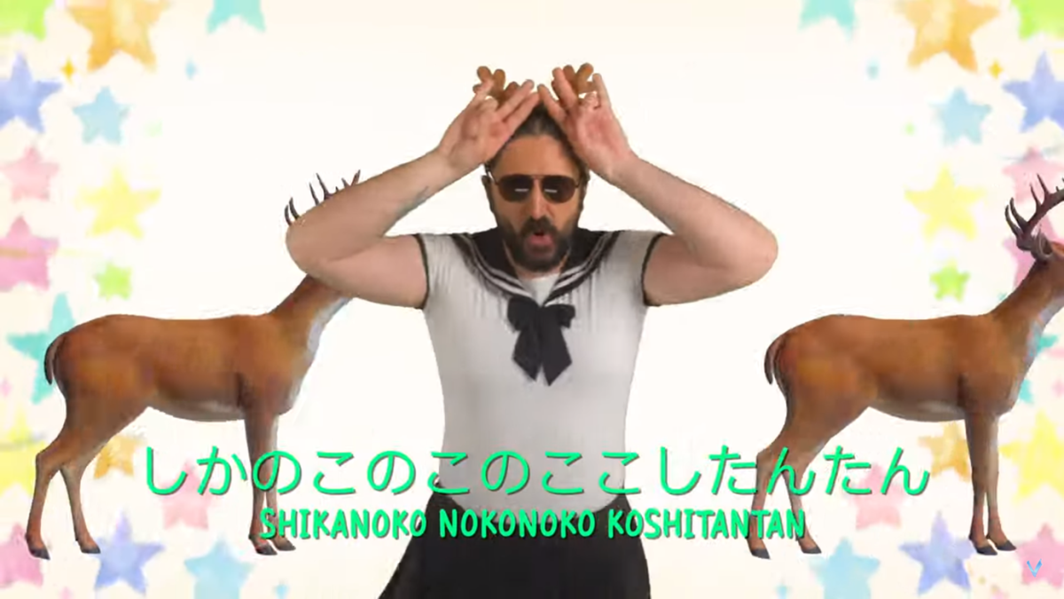 這次他又翻唱搞怪,選擇《鹿乃子乃子乃子虎視眈眈》片頭曲,穿上緊身到不行的水手服跳起 MV 的舞蹈,搭配背景的鹿群們,簡直就是迷因的呈現阿 XD。MV 各位都模仿原作 OP 的場面,效果也十分魔性。