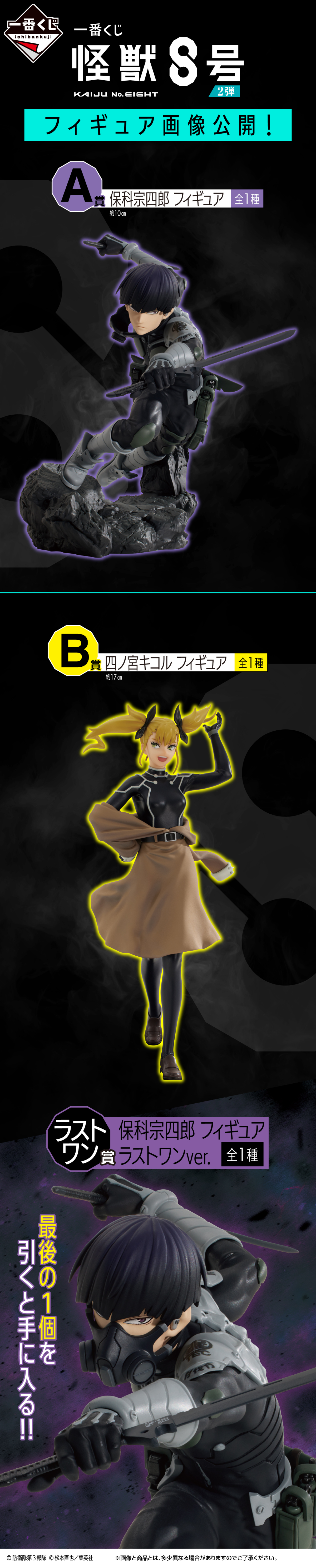 繼先前的「怪獸8號 1彈」推出卡夫卡和雷諾的角色模型等賞品後,本次的「怪獸 8 號 2 彈」再提供 A~F、最後一賞與雙重中獎賞等不同級別的賞品。目前搶先公開了 A、B、最後一賞與雙重中獎賞的角色模型,分別是 A 賞的保科宗四郎、B 賞的四之宮琪歌露以及最後一賞與雙重中獎賞的保科宗四郎最後一賞 Ver.,戴上面罩的保科副隊長散發出了比 A 賞造型更強的殺氣!