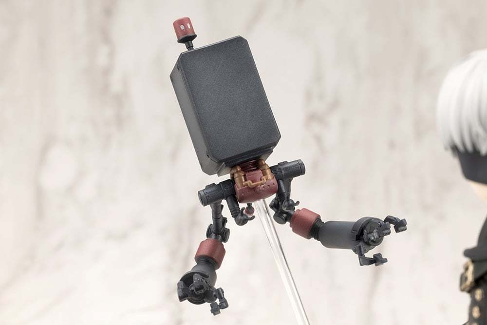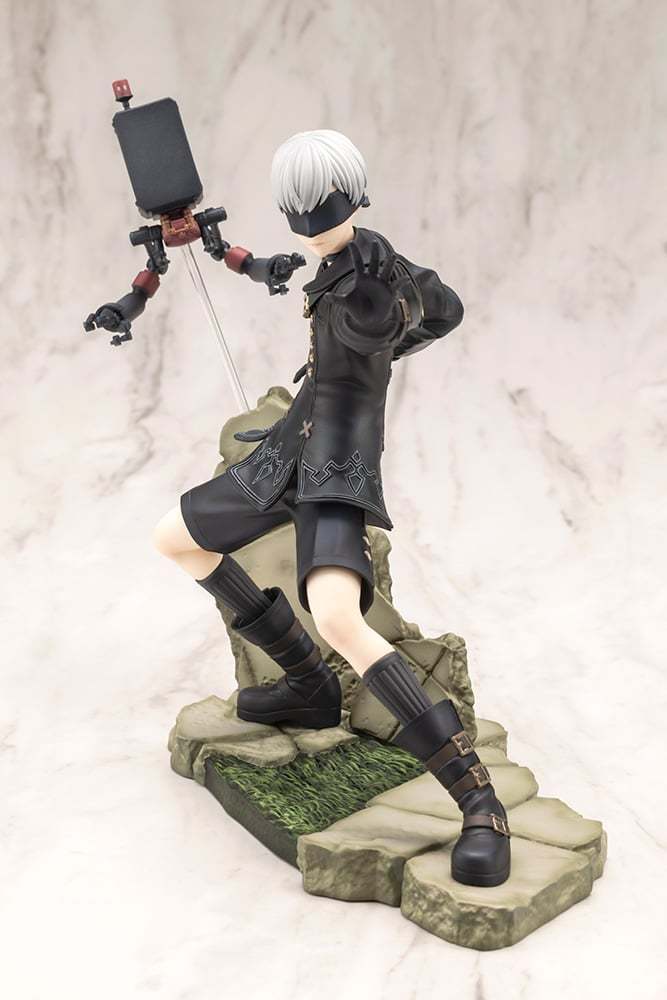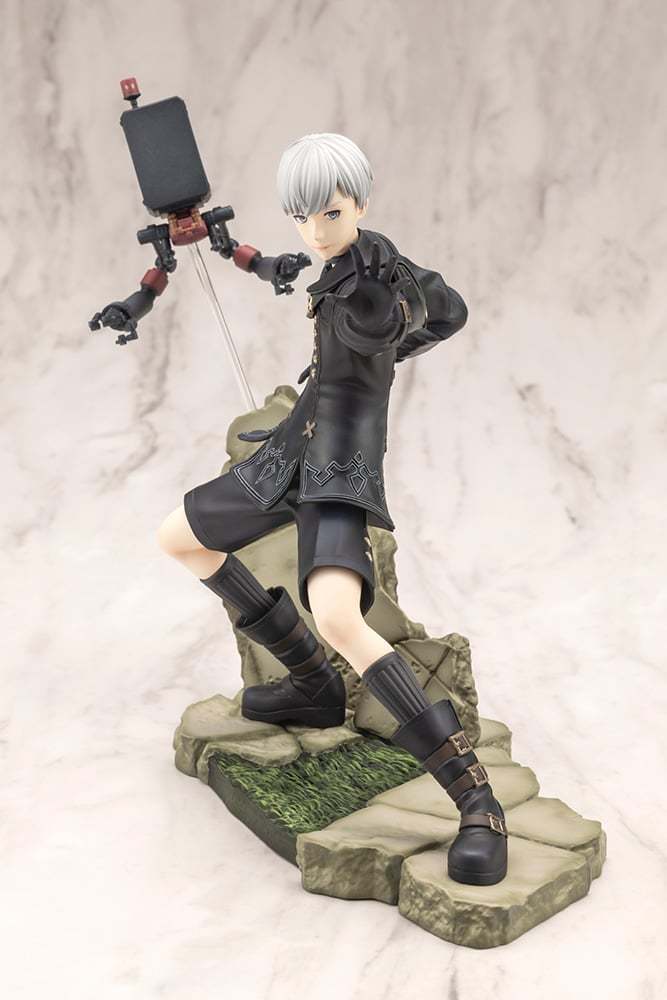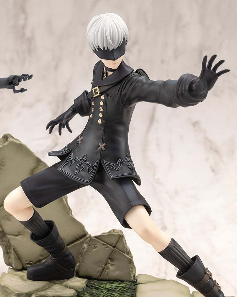 本次的「9S(寄葉 9 號 S 型)」1/8 比例塗裝完成品高約 17.5 公分,為 9S 製作了一手向前延伸的備戰姿態,身後的 Pod 153 也漂浮在空中隨時準備支援,身上歌德風格的衣服及紋路經過細心的刻畫,並以金屬和平面漆色呈現出不同材質的視覺效果,同樣附上了未配戴護目鏡的頭雕讓各位玩具人替換展示。地臺部分呈現的斷垣殘壁場景可以與一同推出的「2B(寄葉 2 號 B 型)」接合,讓擺設的視覺張力大升級!