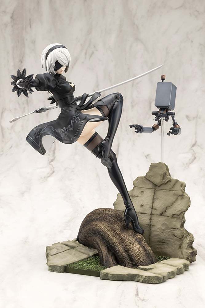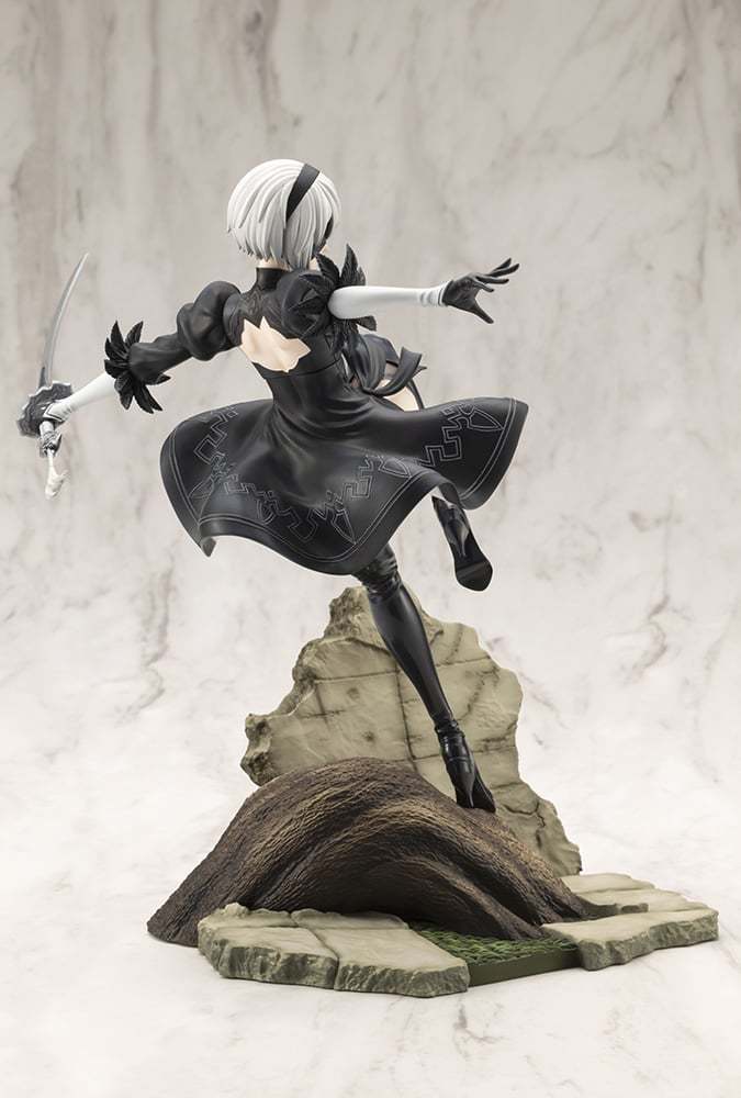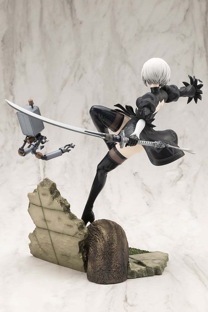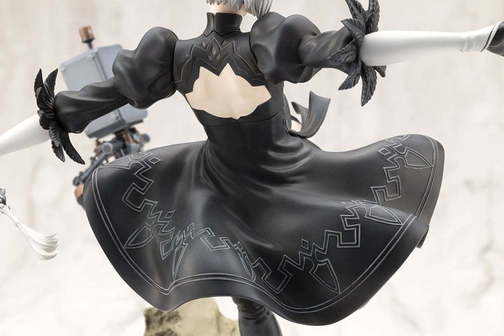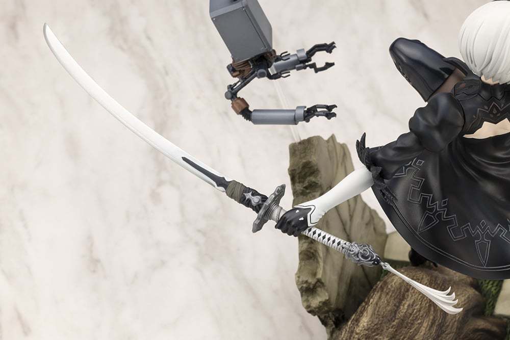 本次的「2B(寄葉 2 號 B 型)」1/8 比例塗裝完成品高約 24 公分,製作出 2B 一腳踏在樹根上,身體騰空,看起來像是準備斬殺敵人的姿態,細節再現了哥德式服裝上的圖案和裝飾,雕刻出衣服隨著姿勢產生的飄逸動態,並附上了未配戴護目鏡的頭雕可以替換展示!塗裝通過微妙的色彩和光澤變化表現出材質的差異,手中的白之契約上的種種細節也都得到了精準的還原!