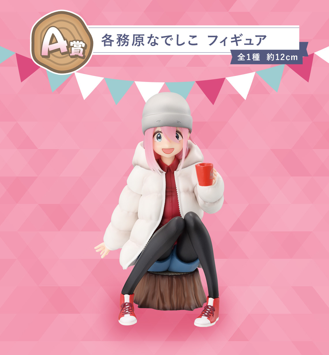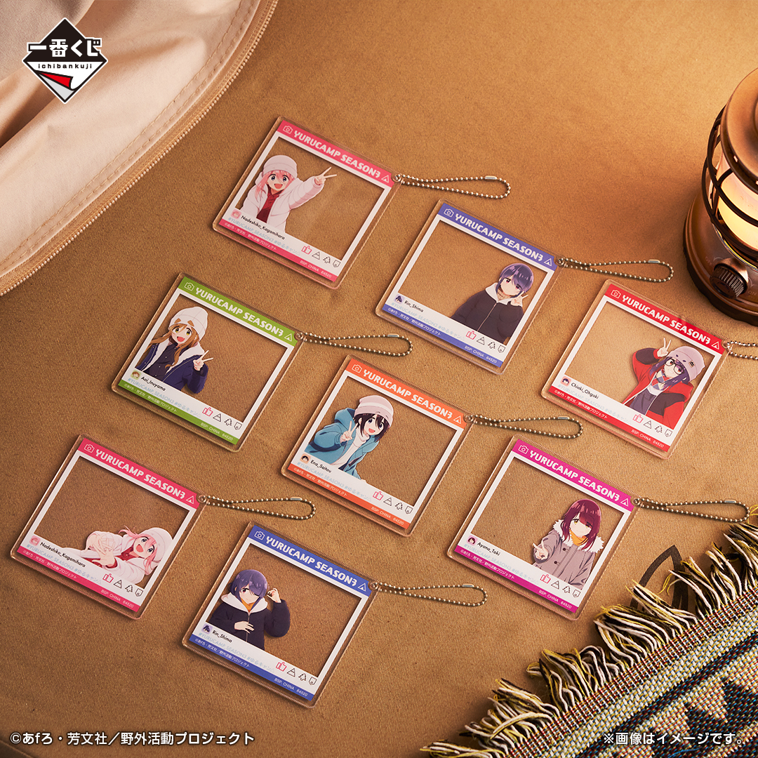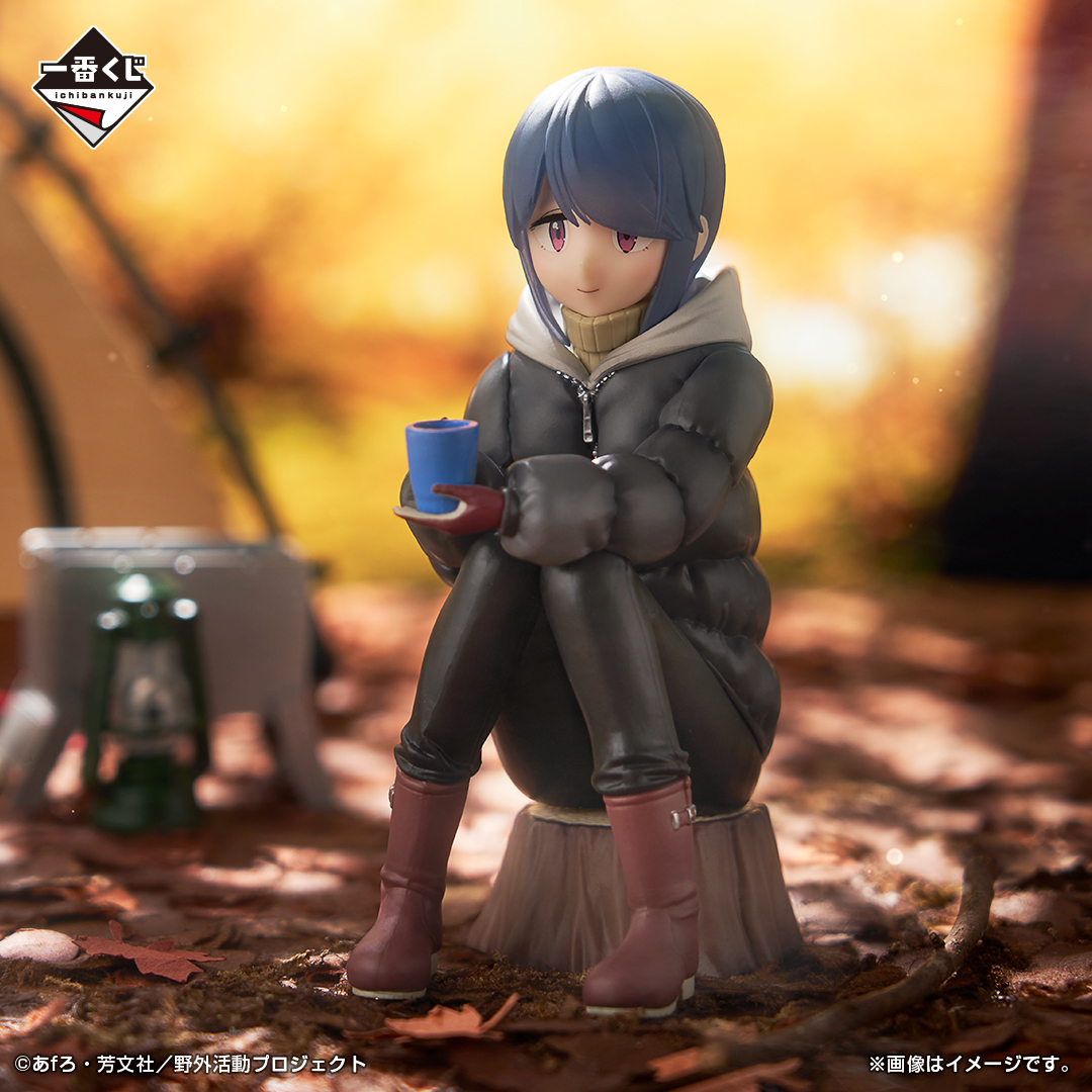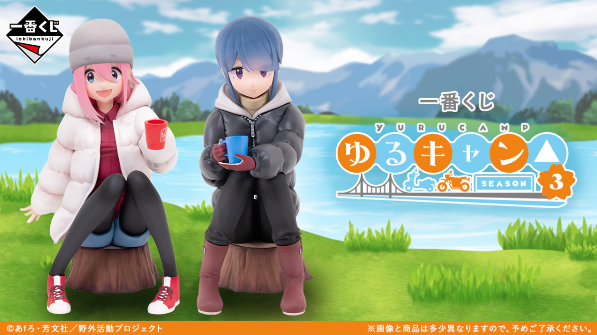 「一番賞 搖曳露營△3」以動畫版第三季的前往吊橋之國的場景為基礎,推出了 A ~ H 賞 + LAST ONE 賞、雙重中獎機會等豐富的獎品,搶先公開的 A 賞「各務原撫子」與 B賞「志摩凜」角色模型,採用坐在樹幹椅上喝著熱呼呼的東西的造型~LAST ONE 賞則是瞇著眼笑,雙手捧著杯子的「志摩凜 最後賞ver.」~另外還有壓克力立牌、馬克杯、皮革風格吊飾、毛巾等不同的周邊!
