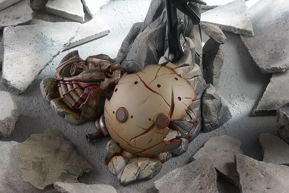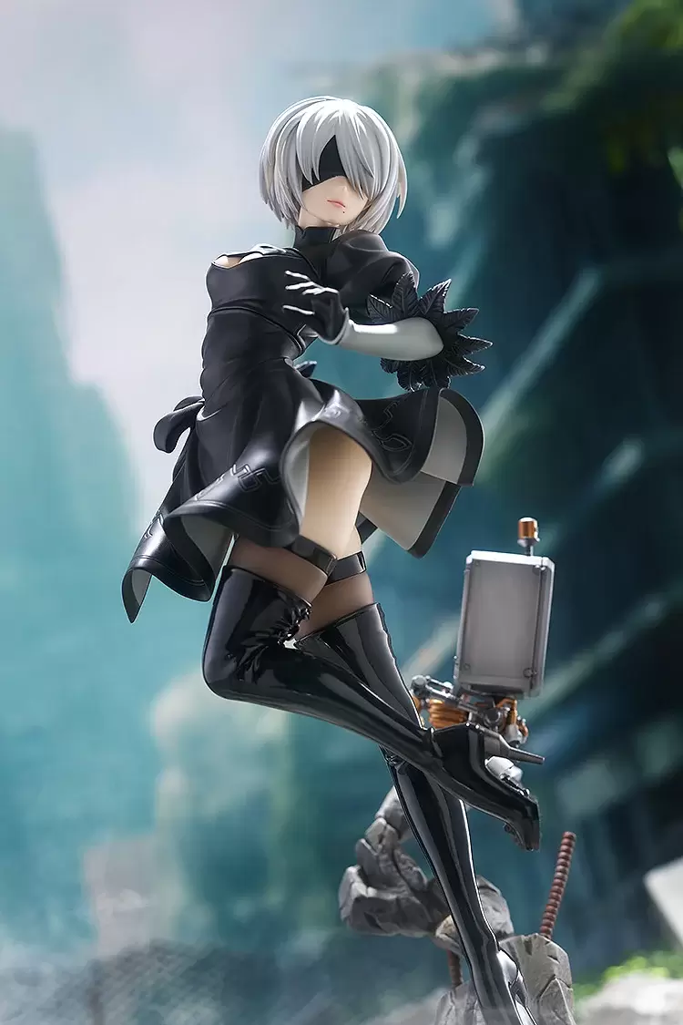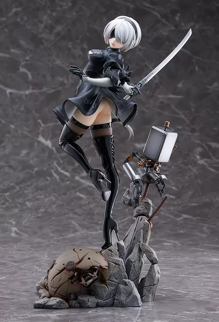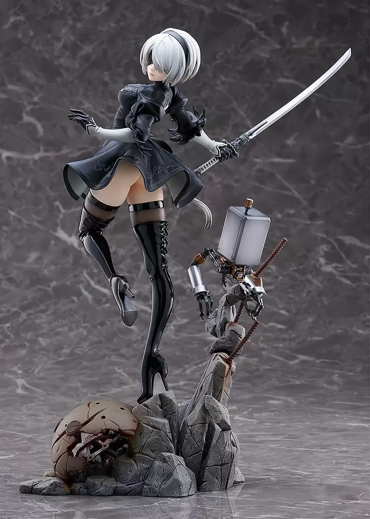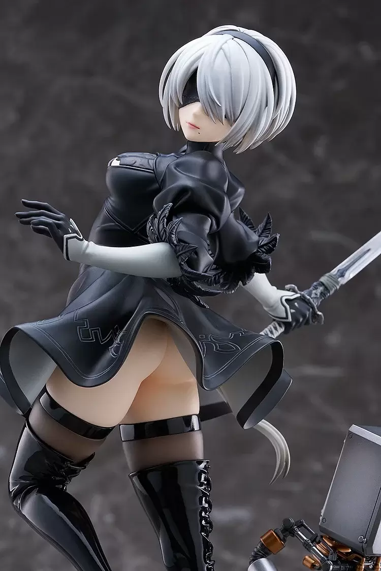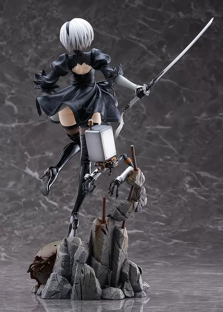 Max Factory「2B」1/7比例模型,尺寸約高 28 公分,細膩製作出 2B 俏麗的五官,將手持純白契約回眸的臨戰姿態立體化,哥德蘿莉風服飾上複雜的鏤空、刺繡等細節造型也仔細呈現;服裝的霧面感以及包裹雙腿的靴子光澤,透過塗裝表現出不同的材質質感。飄逸的裙擺嶄露 2B 優美的臀部和腿部曲線,大幅加強了整體的視覺張力!散落在台座上的機械生命體零件,傳達與機械生命體的激烈戰鬥。