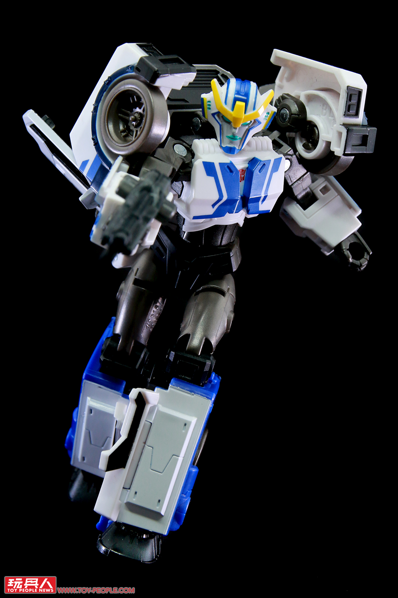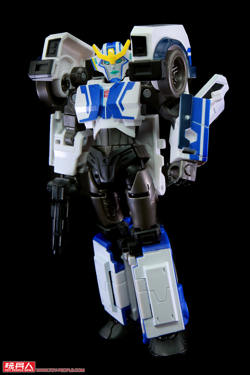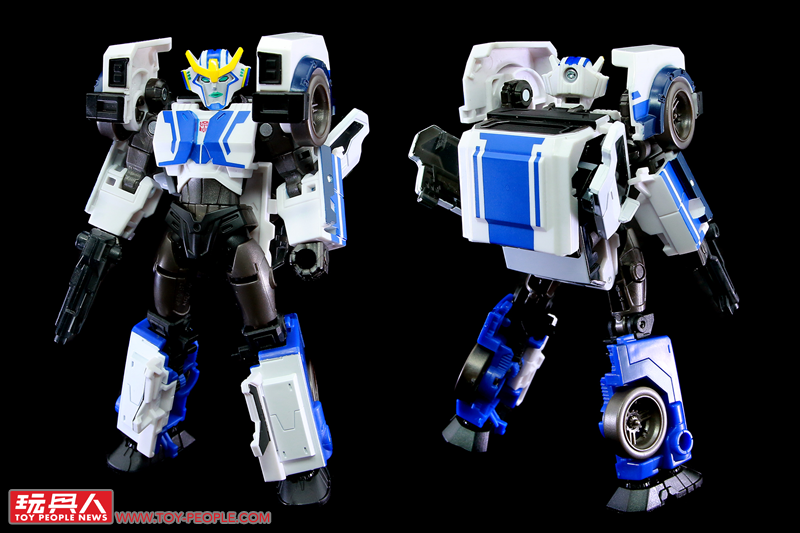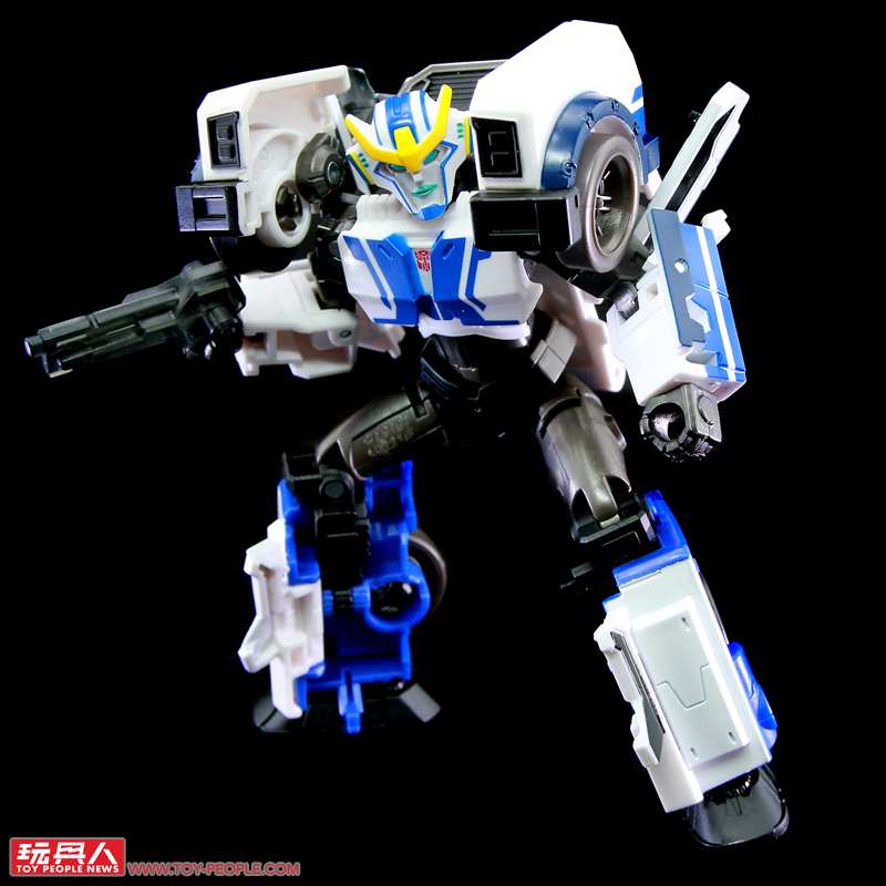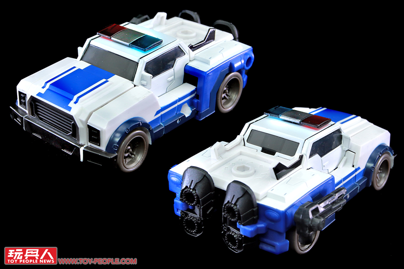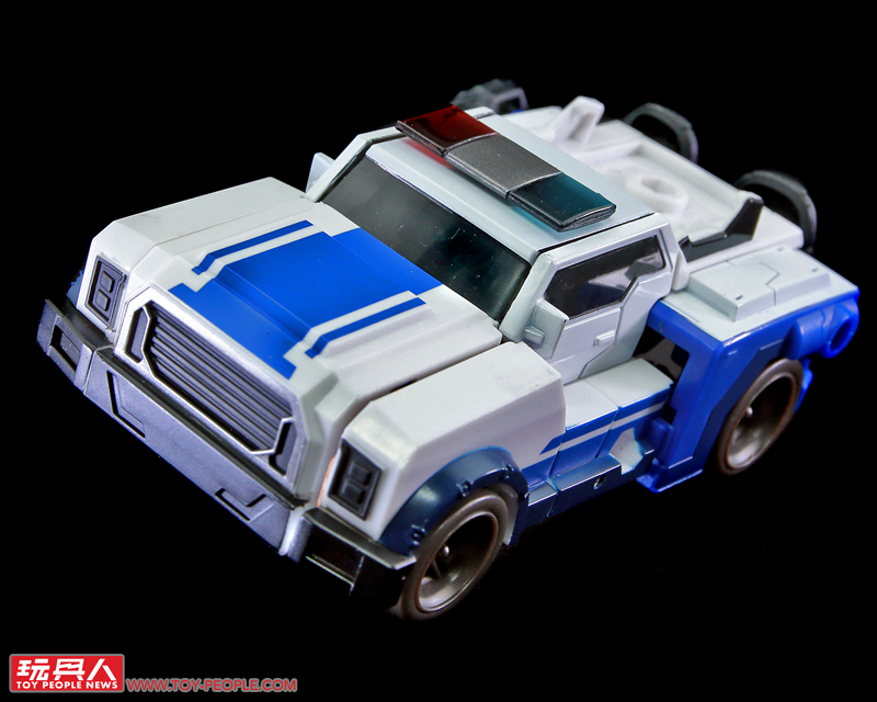 ▼載具模式,變形為藍白色的警用貨卡車,步槍可掛載於車體後側的卡榫。