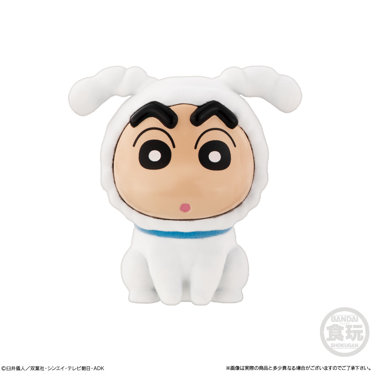 「角色裝扮~蠟筆小新」食玩商品,以小新換上各種裝扮的可愛造型登場~收錄有鱷魚三、企鵝、熊貓、小白、貓咪、大便、兔子,以及看起來像是肥嘟嘟左衛門的隱藏版!每款尺寸約高 7 公分,服裝部分採用蓬鬆材料,並以植絨工藝製成,毛茸茸質感超級可愛!