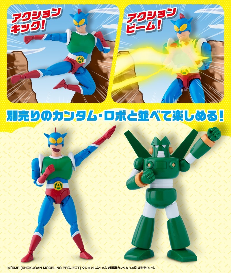 「SMP KIT MAKES POSE 蠟筆小新 動感超人」組裝模型食玩,收錄有高約 15 公分的動感超人本體,還原動感超人藍綠紅配色的超人服,並附有招牌的笑臉、戰鬥時的緊繃臉、經典哈哈哈哈哈的大笑臉三款替換表情零件,以及替換的手勢零件,展現勝利時壓倒性的魄力!
