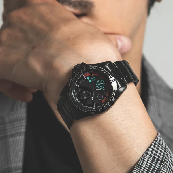 此外,在錶盤下方特別配置了像座艙儀錶板樣式的設計,以及大和號鑑底紅色色塊。甚至時針分針都以大和號主砲和副砲槍管尖端的三條線融入其中,整副手錶以漆黑的模樣,展現出大和號在宇宙堅毅剛勇的形象