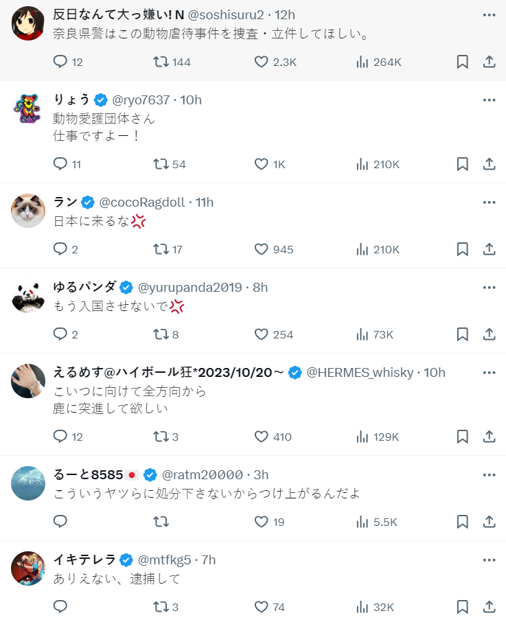 這樣的影片立刻點燃日本網友的憤怒,許多網友痛批 : 「如果不施以重罰,這種事一定還會發生」、「希望奈良當地政府可以處理這種惡質遊客」、「他不知道奈良的鹿是神之使者嗎?」、「這樣虐待動物的行為,在日本可說是重罪」、「快點逮捕他」。