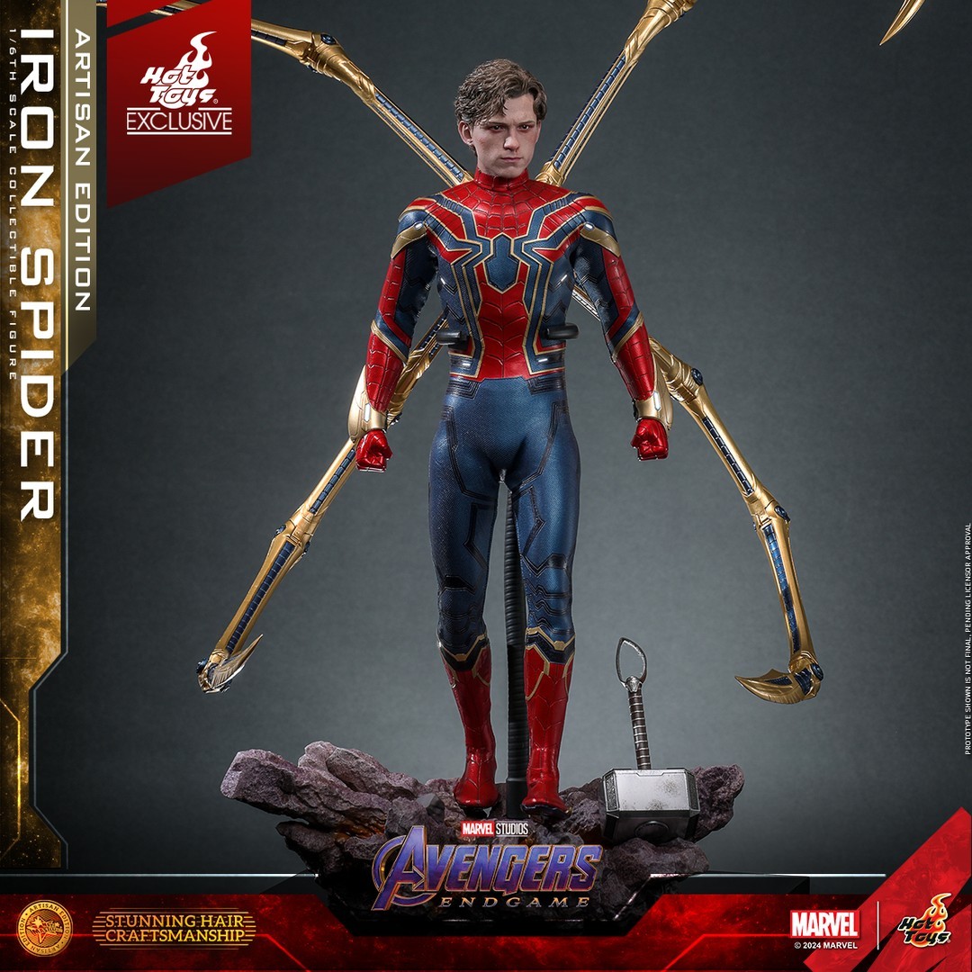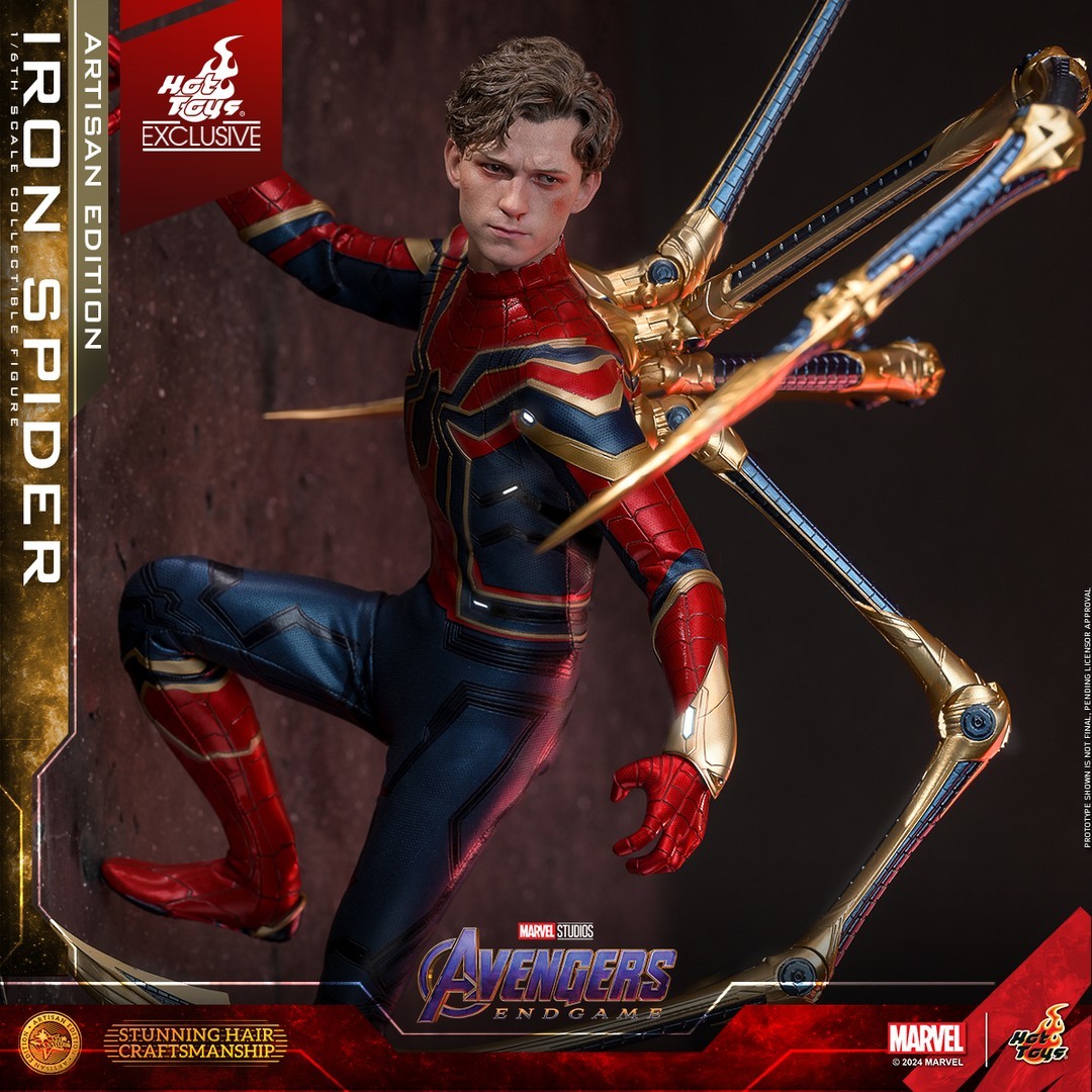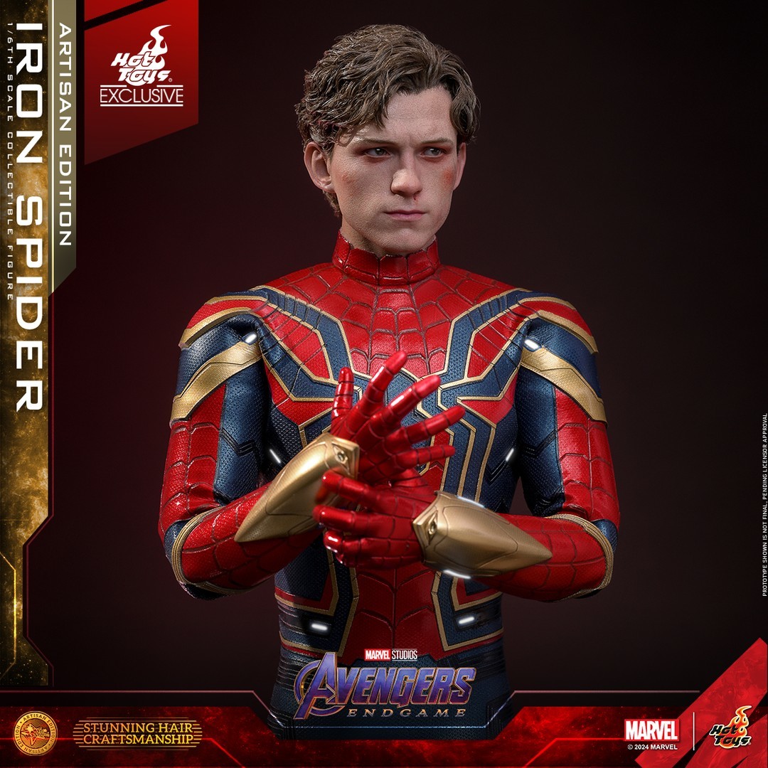 本次推出的鋼鐵蜘蛛(Iron Spider)本體高約 28.5 公分,是彼得在《復仇者聯盟:終局之戰》中最終大戰時的造型。商品仔細的還原演員湯姆·霍蘭德(Tom Holland)的五官特徵,作有可動眼球可以調節神韻,臉上的擦傷、瘀青等細節也都仔細重現!而 Artisan Edition 不同於一般版本的最大的特色在於他標誌性的綠色捲髮是由植髮師一根根細心的植入,讓整體看起來更佳的逼真!