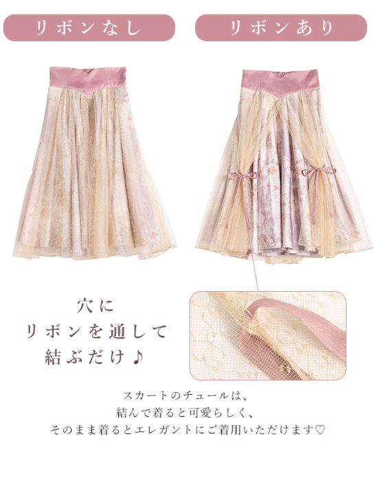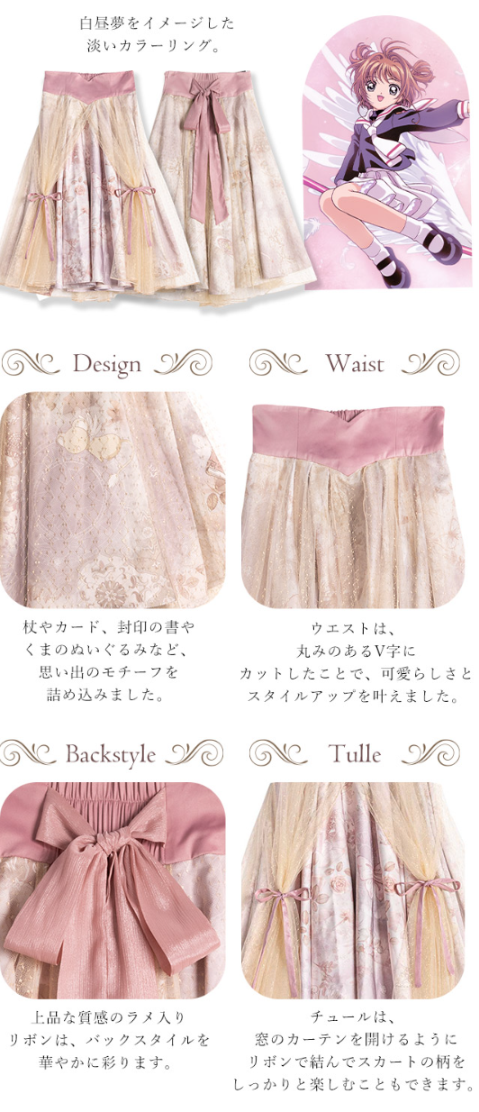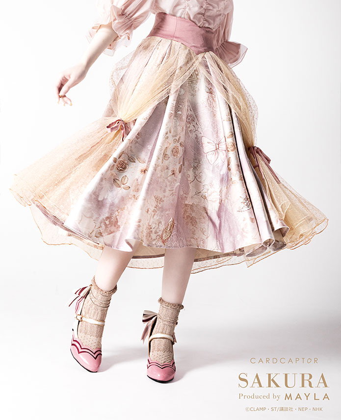 採用多層次的華麗風格,前面有如窗簾的設計敞開後可以看到內裡的圖案,包含 : 魔法杖、封印之書、庫洛牌、可魯貝洛斯等圖案,後方腰部搭配 MAYLA 招牌的蝴蝶緞帶,粉色系非常讓人少女心大發。