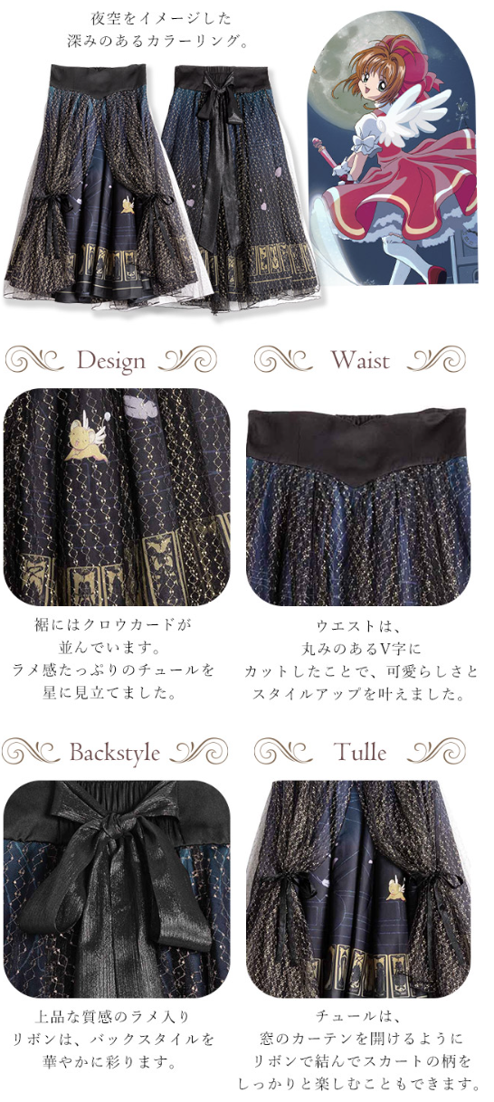 以黑色夜空為基礎,前面有如窗簾的設計敞開後可以看到內裡的圖案,有著夜空背景與可魯貝洛斯,下擺更有一張張庫洛牌的圖案,後方腰部搭配 MAYLA 招牌的蝴蝶緞帶,粉色系非常讓人少女心大發。