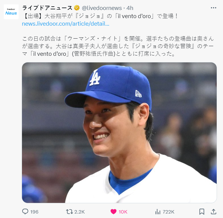 今日 ( 7/24,美西時間 23 日 ) 道奇隊主場舉辦「Women’s Night」主題活動,球員也攜家帶眷參戰。其中焦點的大谷翔平,在今天出場曲選用了《JoJo的奇妙冒險 黃金之風》喬魯諾·喬巴拿的經典 BGM「il vento d’oro」上場打擊,立刻成為日本與世界關注的對象。