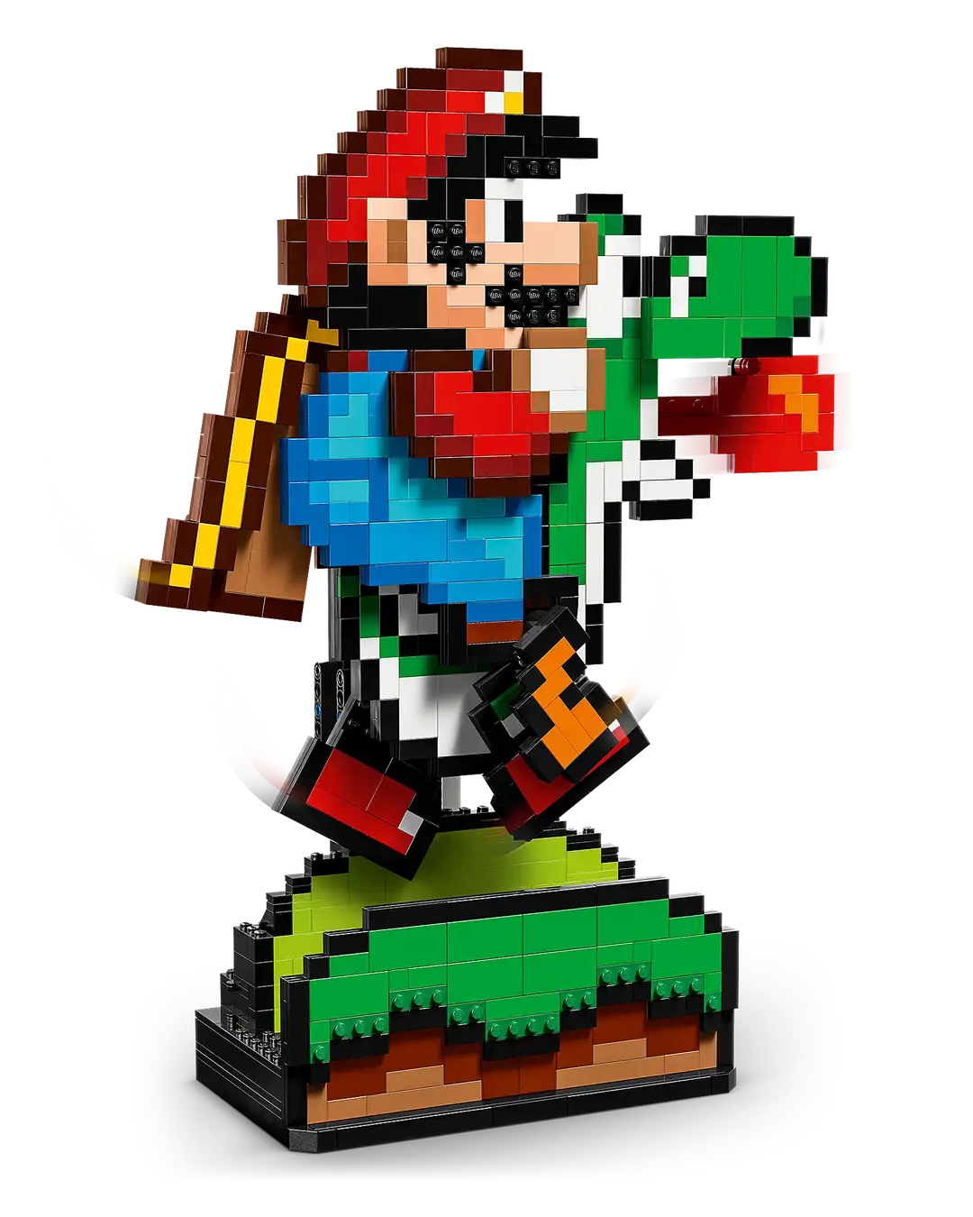 本作一共有 1215 片零件,完成之後高約 40 公分,採用像素風格呈現瑪利歐騎乘耀西的經典造型,並同時製作出地圖環境的底座,除了可以深刻感受到《超級瑪利歐世界》的遊戲魅力、鮮豔的色彩構成之外,更能透過機構連動讓這款模型動起來,彷彿就是電玩畫面在眼前活過來一樣!值得一提的是,內容中還有可以跟超級瑪利歐、路易吉、碧姬公主冒險主機連動的零件,進一步拓展遊玩體驗。