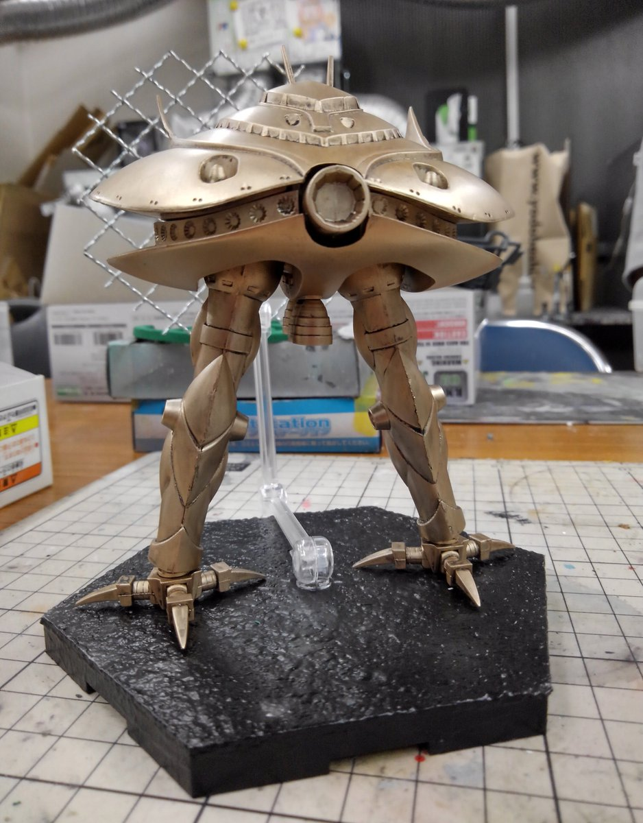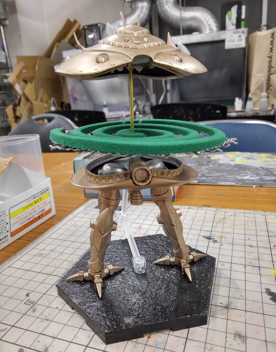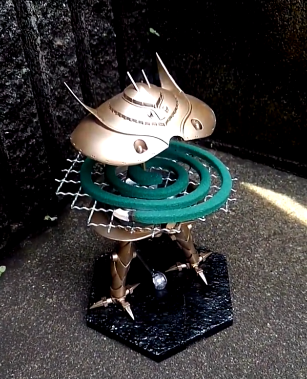 他將原先畢格薩姆的模型進行加工並重新塗裝,在身體上半部分成兩半,讓中間可以加入鐵條支架,並塗裝成銅金色的樣式。只要配上鐵架跟鐵網,就可以輕鬆把蚊香擺放上去,作為蚊香架使用。