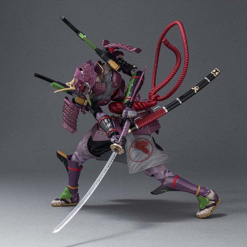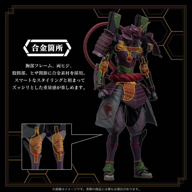 「RIOBOT 泛用人型合戰兵器 武者初號機」擁有全高約 25.5 公分尺寸,運用部分合金製關節、塑膠外裝等多種材質製成可動規格,細膩刻畫出由岡崎能士設計的武士鎧甲造型,將家紋、草鞋、盔飾...等豐富元素巧妙融入初號機原本的拘束器(裝甲)中,施以豐富的色彩塗裝表現各部金屬質感。