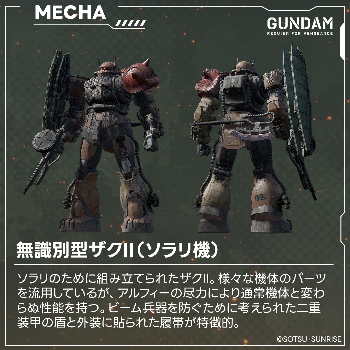 無識別型薩克Ⅱ(索拉利機)是為了讓主角索拉利能夠對抗聯邦軍的白色惡魔 ― 鋼彈EX而緊急製作的機動戰士。此機由數種機體零件拼裝而成,盡可能地維持和一般薩克相同的性能,同時也考量需抵禦鋼彈所使用的光束武器,在正面裝甲貼上大量履帶,並配備雙層裝甲構造的盾牌。