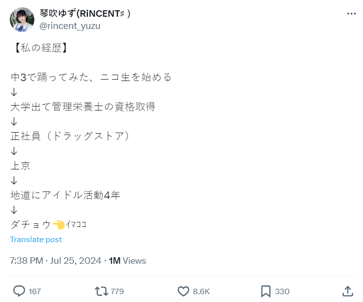 鴕鳥影片爆紅後,琴吹ゆず也在 X 上自我介紹,不只是鴕鳥的中之人,還揭露自己的經歷,從國三後開始跳舞、成為 niconico 直播主,大學畢業後獲得營養管理師資格在藥局工作,後來上京成為地下偶像 4 年,現在變成鴕鳥了 www。