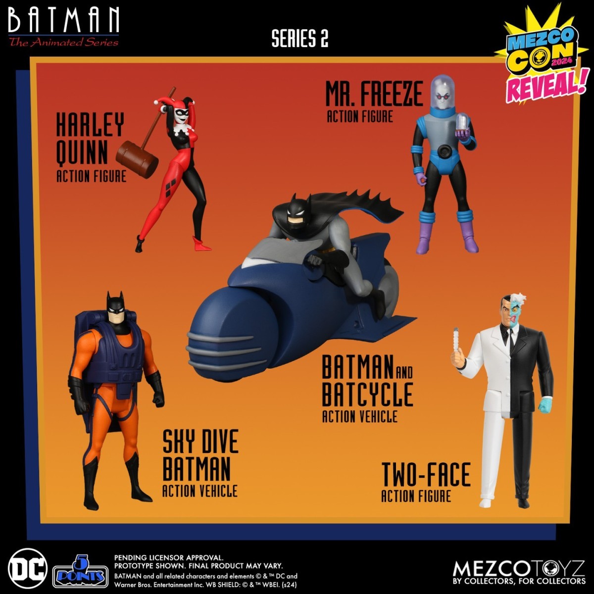 首先第一個公布是在 MEZCO TOYZ 旗下推出過眾多經典 IP 角色 3.75 吋可動人偶的「5 Points」系列將推出經典影集《蝙蝠俠:動畫系列》主題的新商品——「5 Points《蝙蝠俠:動畫系列》2」,收錄哈莉·奎因(Harley Quinn)、急凍人(Mr.Freeze)、雙面人(Two-Face)三位反派以及兩款蝙蝠俠在劇中的造型!