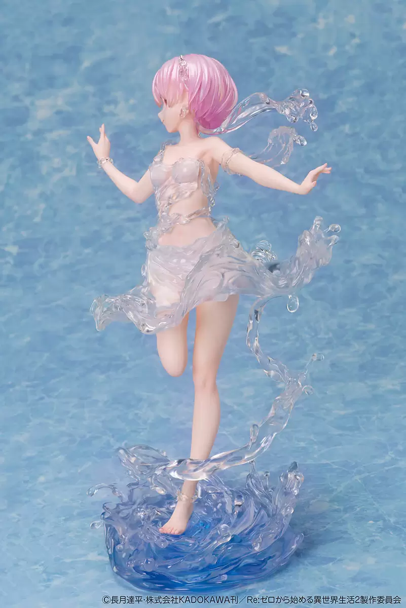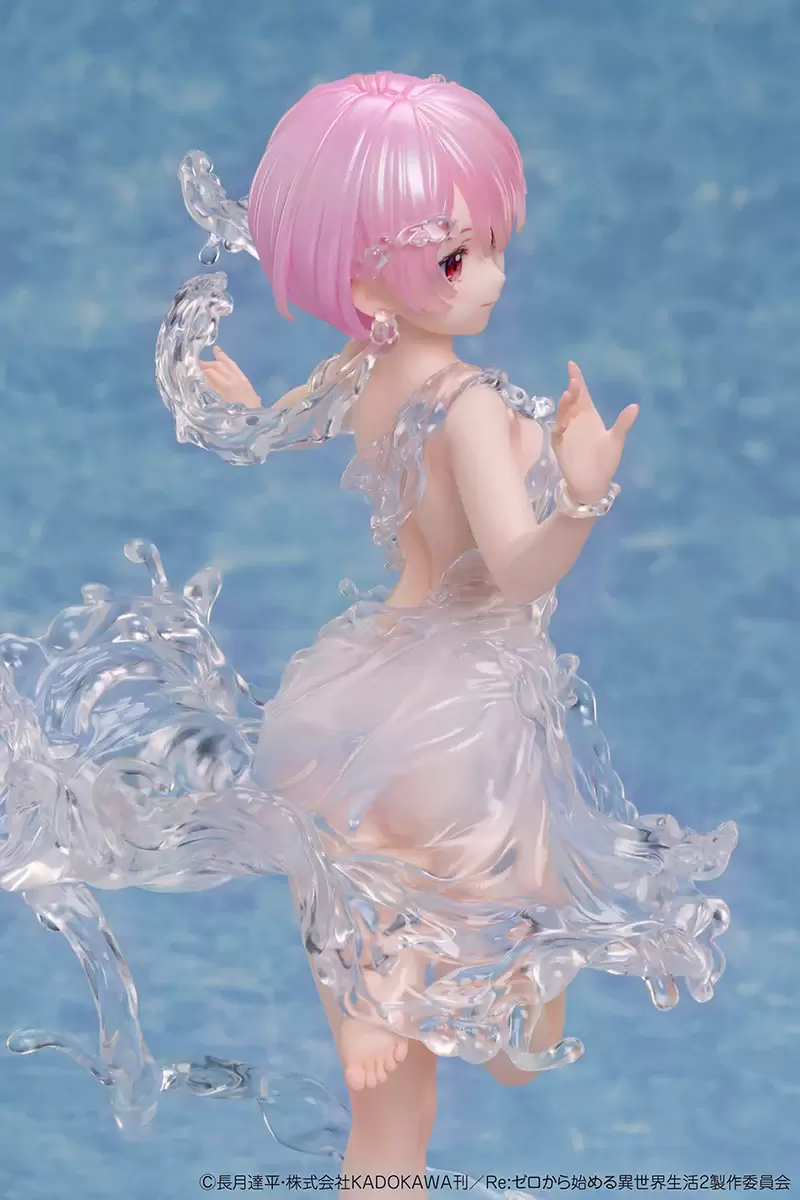 Design COCO「拉姆 -Aqua dress-」1/7比例模型,尺寸全高約 23 公分,將拉姆穿著高透明度、高流動造型的「水之禮服」造型立體化!輕透的透明材質表現出流體的效果,賦予它看起來像真正的水一般纏繞在拉姆白皙的身軀上,水珠順著身體曼妙的線條流落至底座,裙襬優美飄動;原本特徵的粉紅色短髮施以美麗的珍珠光澤並採用透明材質打造,整體呈現輕盈透明感!除了活潑的笑臉表情之外,另外附屬有抿嘴微笑的替換表情,展現不同的氛圍。