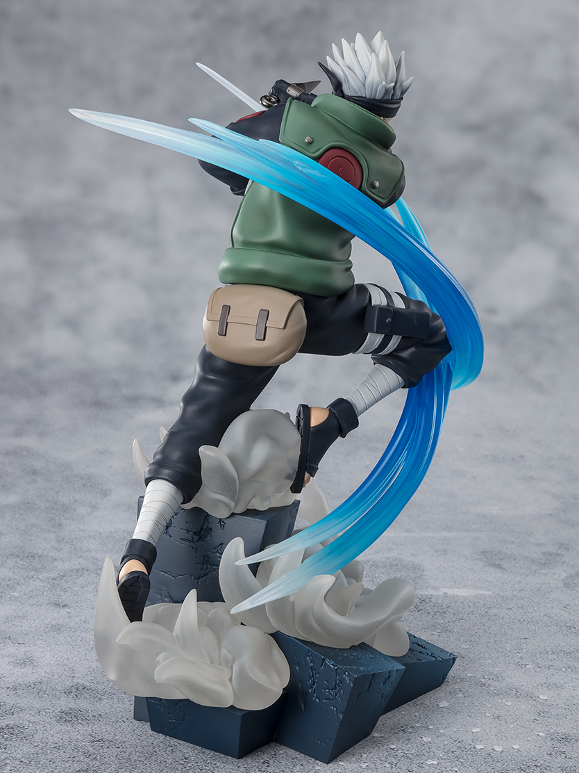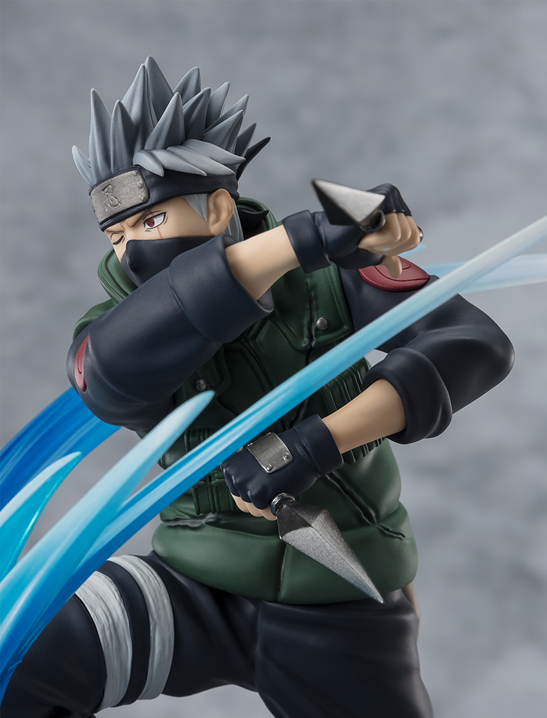 本次的「旗木卡卡西 - 與昔日好友的對決 -」塗裝完成品高約 20 公分,製作了卡卡西在異空間中手持雙苦無與帶土對戰的動態,細緻的雕刻並上色還原卡卡西豎起的頭髮及漸層,身上上忍背心及服裝的皺褶也都細節再現,底座製作出神威空間中傾斜的方塊地面,腳底的煙塵延伸至卡卡西前方的斬擊特效,可以與提早一個月推出的「宇智波帶土- 與昔日好友的對決 -」一同擺設,重現這場昔日好友間的信仰之戰!