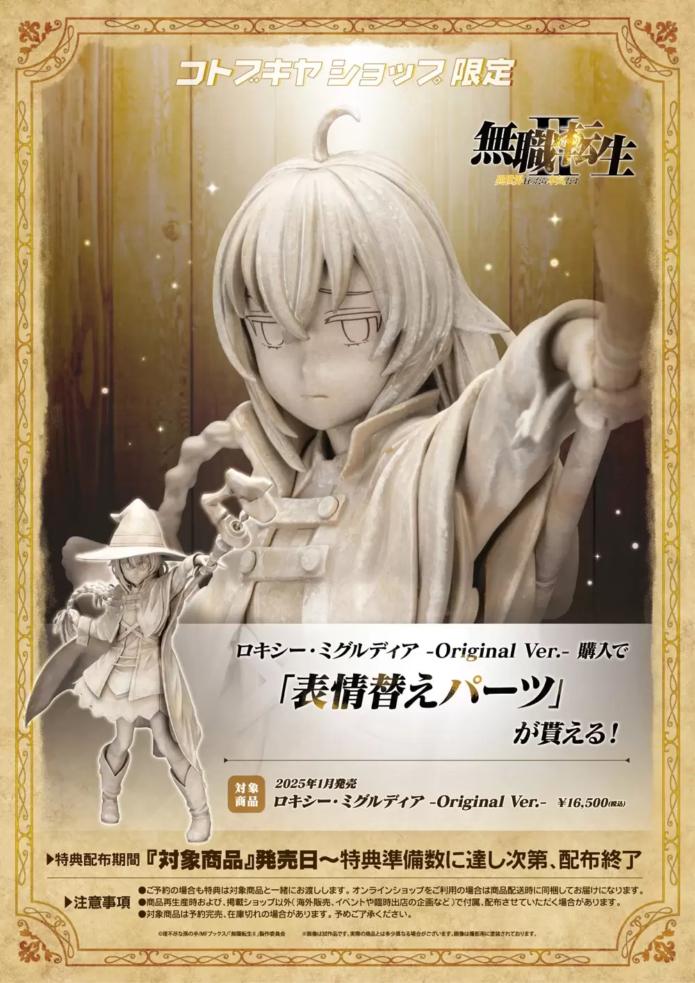 日本壽屋玩具公司(KOTOBUKIYA),繼大人氣的洛琪希之後,又將以《無職轉生 ~到了異世界就拿出真本事~》為主題,推出原色版本的「洛琪希·米格路迪亞 -Original Ver.-」1/8 比例 PVC 塗裝完成品,徹底將劇中模型實體化!參考售價為 16,500 日圓,預計將於 2025 年 01 月發售。