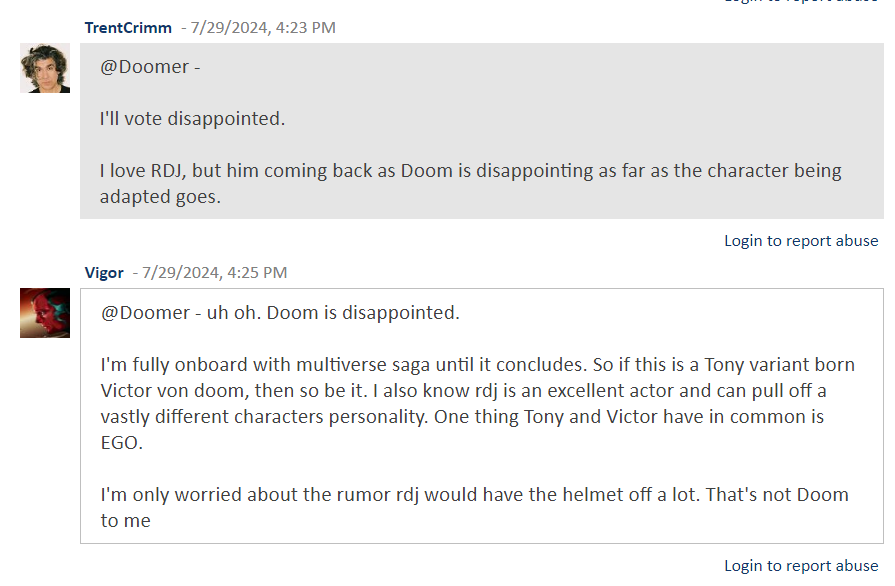 因此,對於部分原作粉絲表示,只能希望這個由小勞勃·道尼所飾演的「末日博士」,不是被設定成東尼·史塔克的變體,而只是維克多·馮·杜姆剛好有著與東尼相同的一張臉,至少這樣子,多少還能夠完整塑造維克多這個角色的人設。