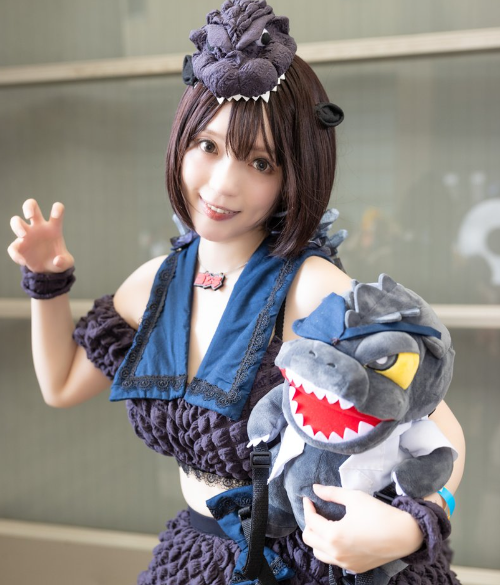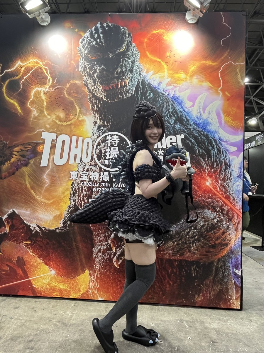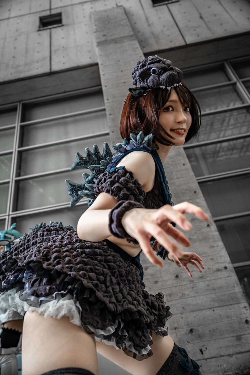 除了模型外,WF 也是 Coser 雲集的年度盛事,先前我們介紹過屢屢挑戰怪獸娘裝扮的 Coser もころす ( @mokorosu ),這次也沒有缺席,再次以《哥吉拉》作為挑戰,不過這次選擇的是「元祖哥吉拉」打造 Cos 服裝,以怪獸娘的樣貌吸引不少鎂光燈跟話題。
