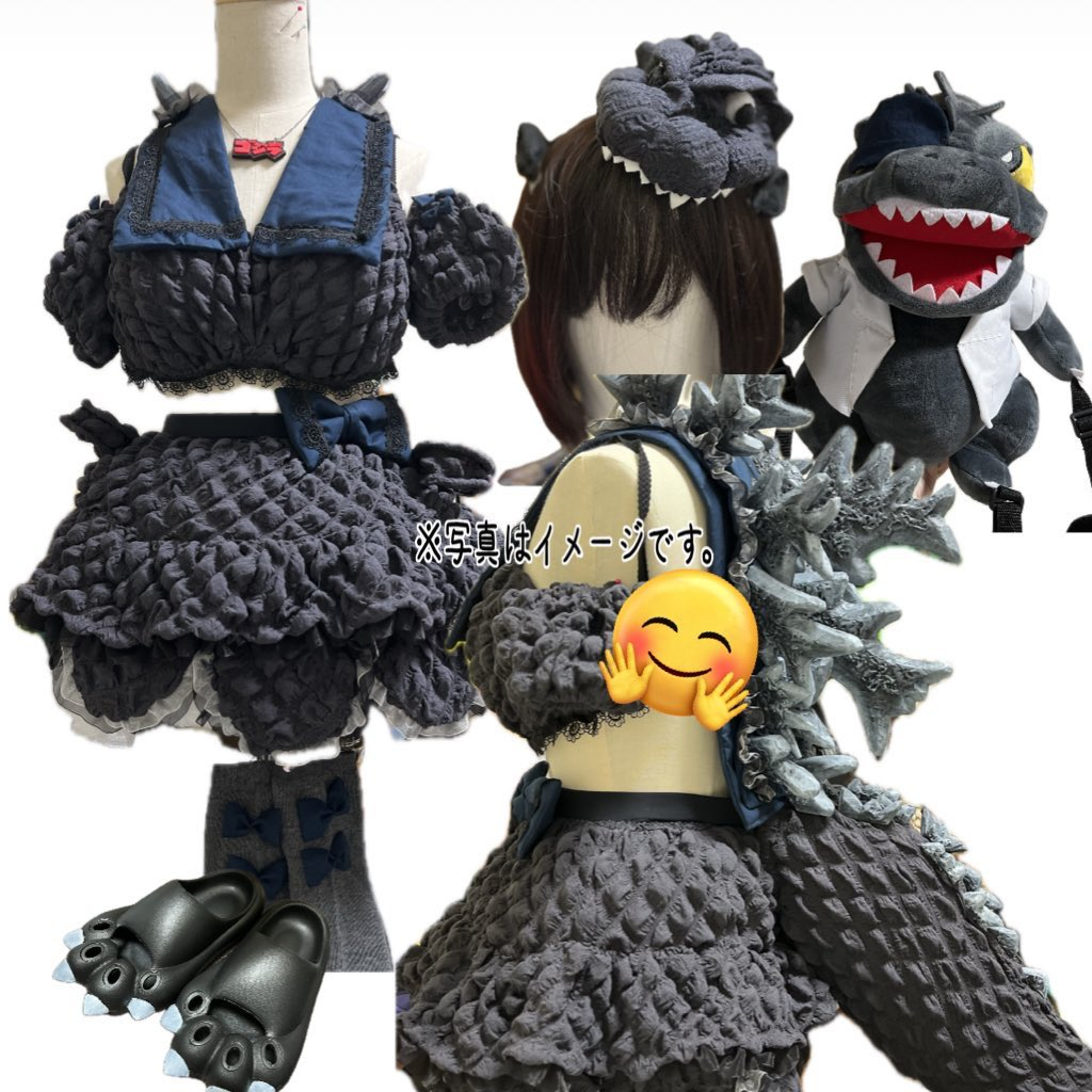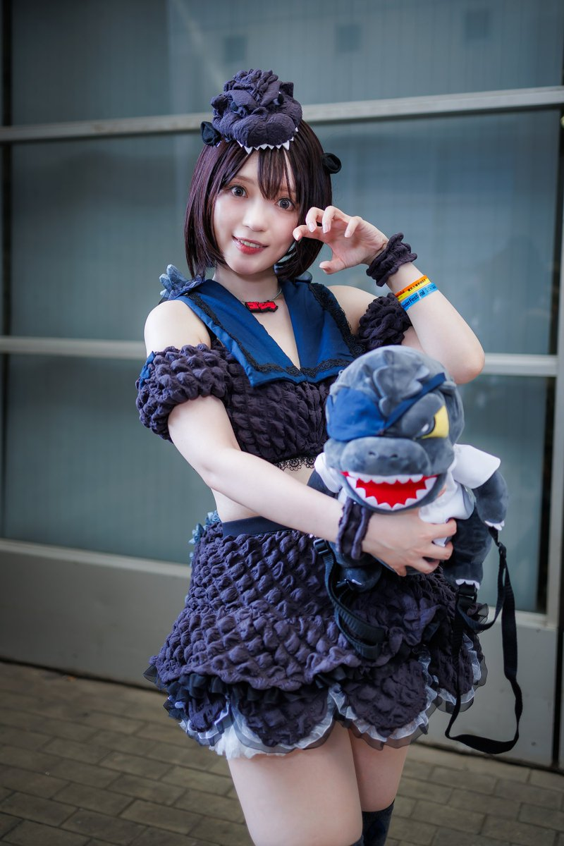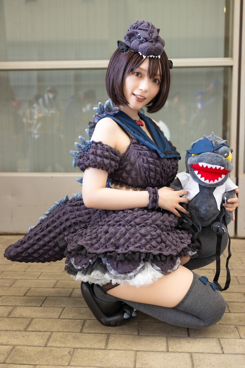 一向對怪獸擬人化充滿熱情的もころす,這次服裝也是自行設計打造而成,將元祖哥吉拉粗曠的皮膚變成兩截式的服裝,搭配像是哥吉拉的娃娃、背鰭、尾巴、專屬大腳的鞋子。連項鍊都配戴初代經典 LOGO 的樣式,頭上還有個自製的哥吉拉帽子,超可愛又有哥吉拉的識別度。