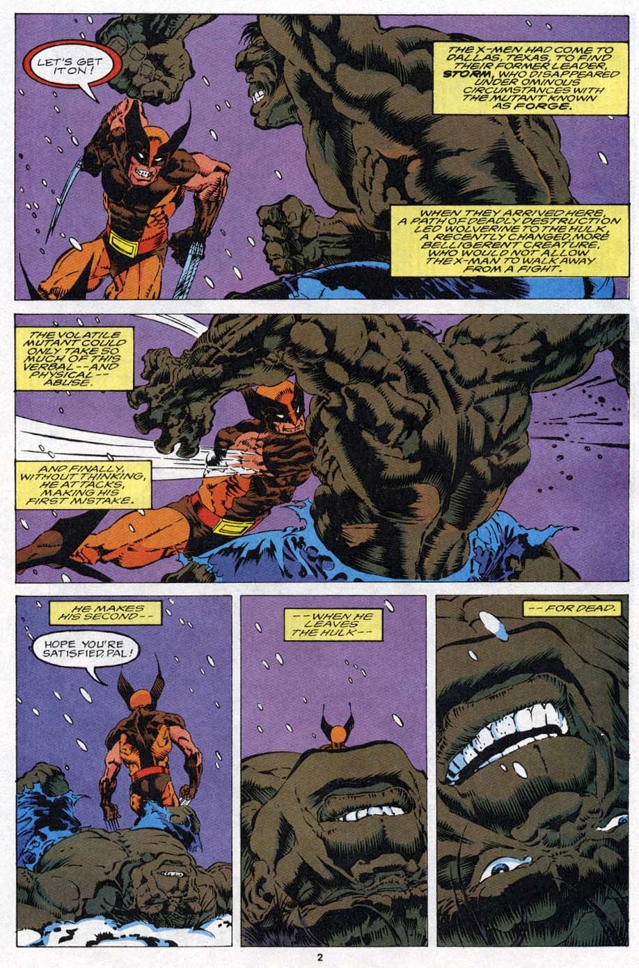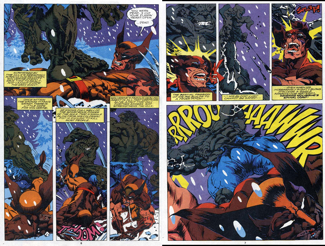 而在浩克得到失望的答案後,準備殺死X教授的同時,X戰警介入了這場復仇之戰,而參與其中的金鋼狼也持著他的利爪,與憤怒的浩克進行一場你來我往的對峙,一路打進了森林裡持續「總是要面臨同樣對決」的戰鬥,只不過也因為浩克狠狠地往狼叔的腦袋敲去,一直到紅坦克介入之前,就幾乎差點就殺死了他。