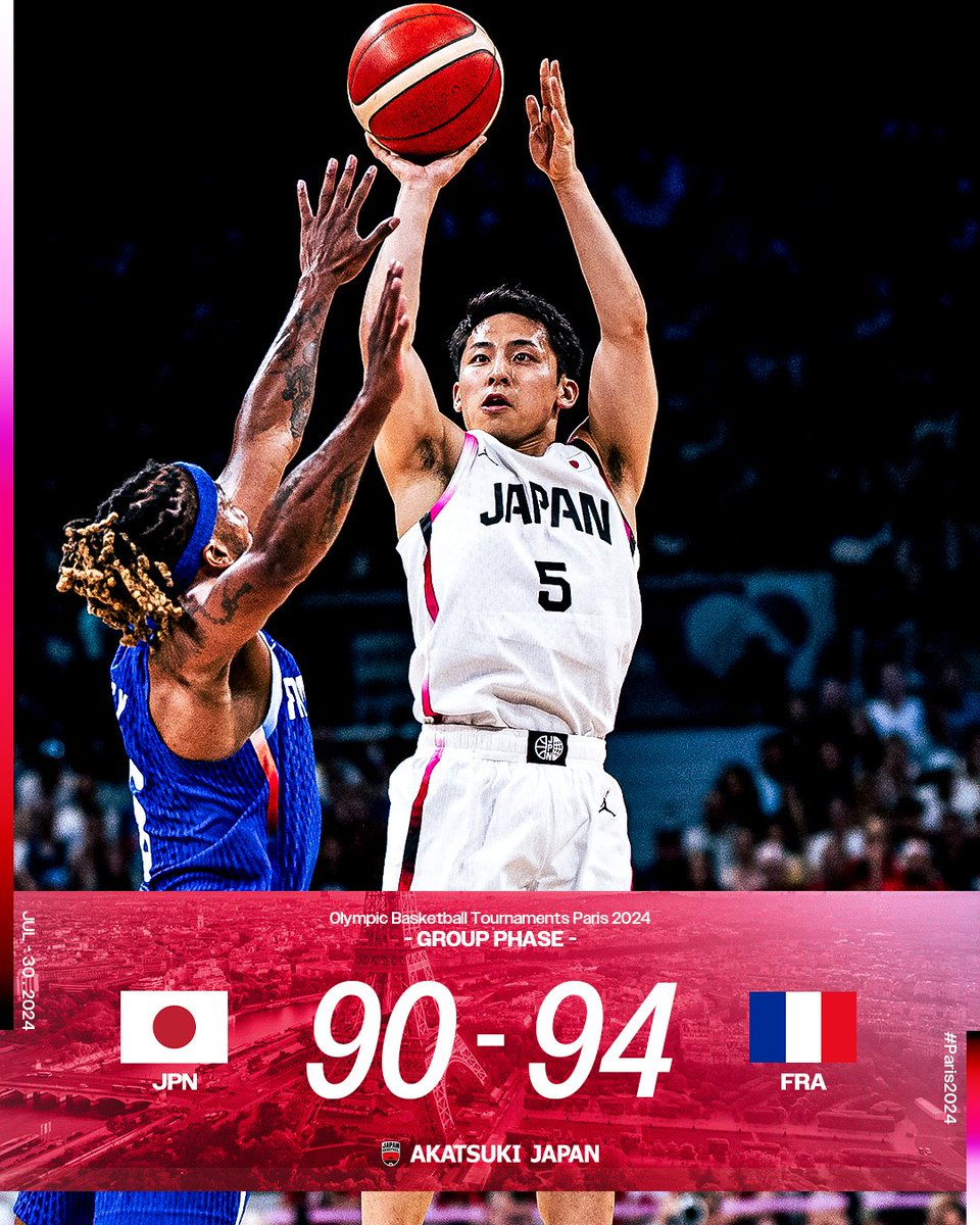 今日 ( 7/30 ) 晚間開打的男籃項目,由日本對上地主國法國,雙方鏖戰到延長加時賽,最後日本以 94 比 90 敗給法國,讓奧運男籃奪下第一勝的契機溜走,不過這樣的表現已經讓不少人跌破眼鏡,畢竟身為男籃項目亞洲唯一國家,能跟法國拚到最後,已經非常難得。