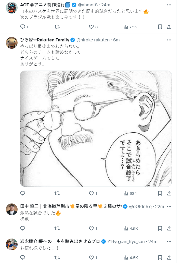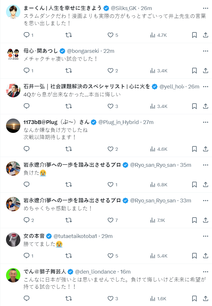 《灌籃高手》作者井上雄彥也發文讚賞這是一場好比賽,對於日本選手的表現真的值得尊敬,讓世界看到他們是值得擁有勝利的。雖說這場比賽輸了,但仍有挑戰八強資格的機會,接著面對巴西就要全力拚下了。