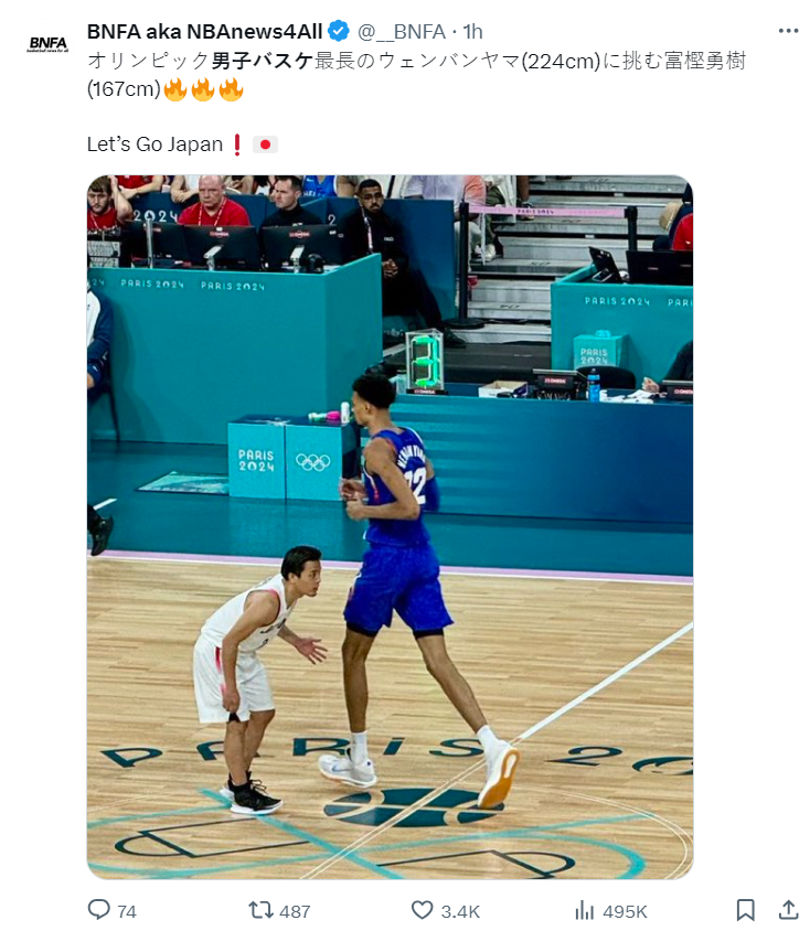 ▼ 甚至後衛富樫勇樹與 Wembanyama 的身高差照片,也在 X 上瘋傳。