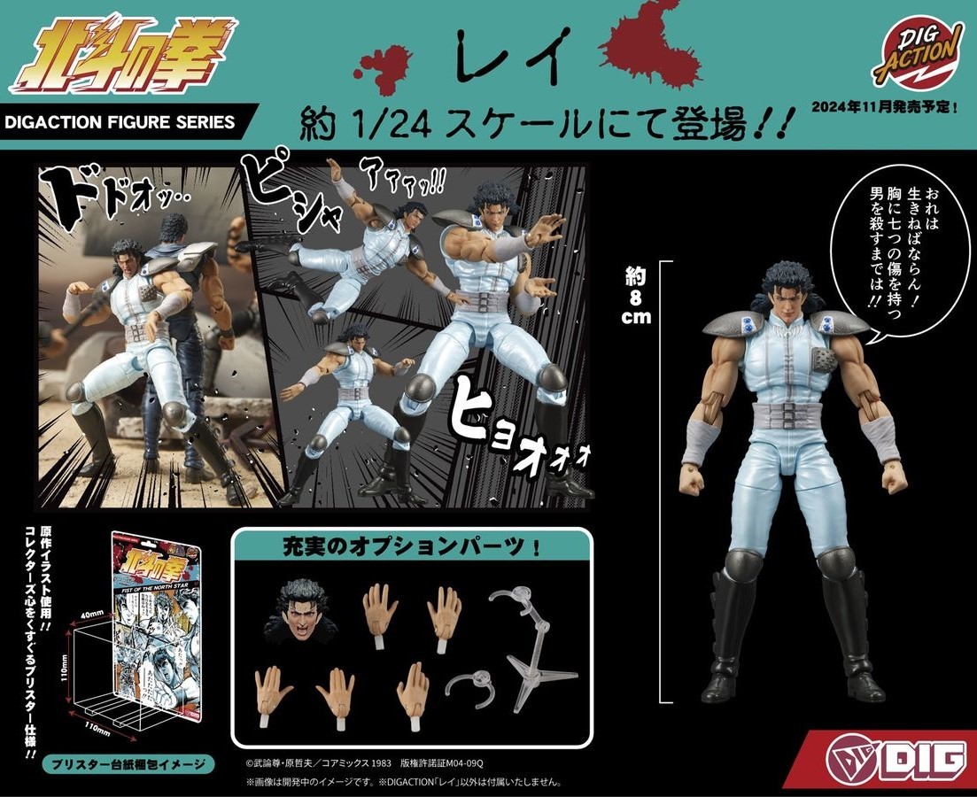 日本 M.I.C. 公司旗下玩具品牌 DIG 推出的可動人偶「DIGACTION」系列,繼「拳四郎」、「希恩&紅心」等商品後,再度發表了出自《北斗神拳》的最新商品「DIGACTION 雷伊」!參考售價為 5,500 日圓,預計將於 2024 年 11 月發售。