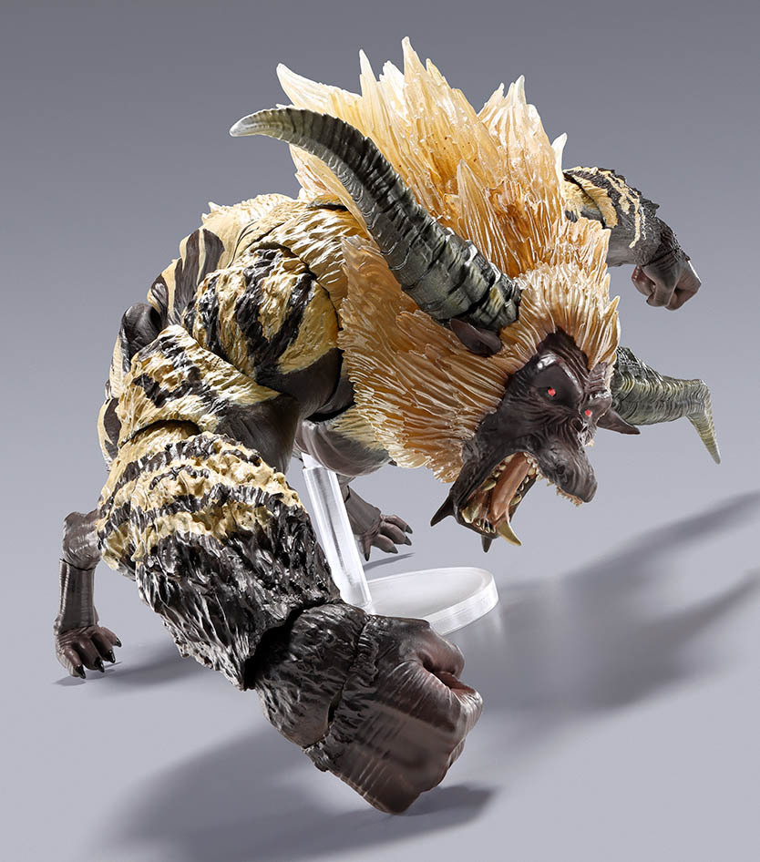 「S.H.MonsterArts 激昂金獅子」透過生動造型、精密的可動分割設計徹底再現遊戲中的形象,特徵的金色毛髮採用透明零件表現光澤感,全身特徵的黑黃相間條紋也施以色彩塗裝再現。全身設計出可動部位多、內部零件不外露的關節,能夠把玩出各種攻擊、威嚇甚至是躺平睡覺等姿勢。