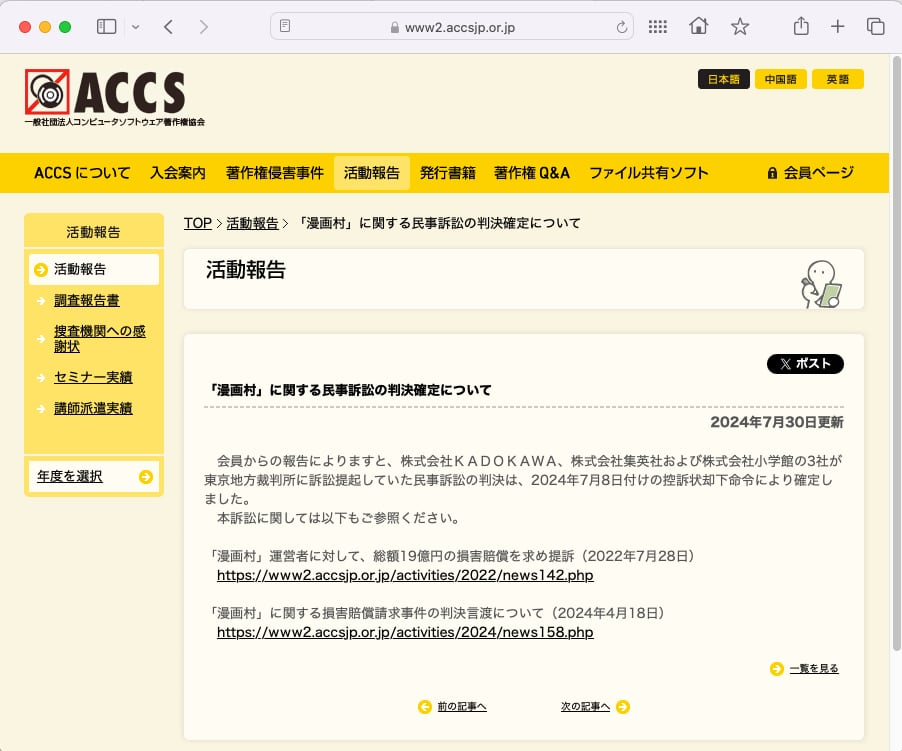 不過不只如此,三大出版社角川、集英社、小學館在 2022 年更向漫畫村提出超過 19 億日圓的賠償。經過了約兩年多法院審判,在近期日本電腦軟體著作權協會(ACCS)也正式公布,該案民事訴訟判決已定,最終判賠 17 億 3664 萬 2277 日圓,全案不得上訴定讞。