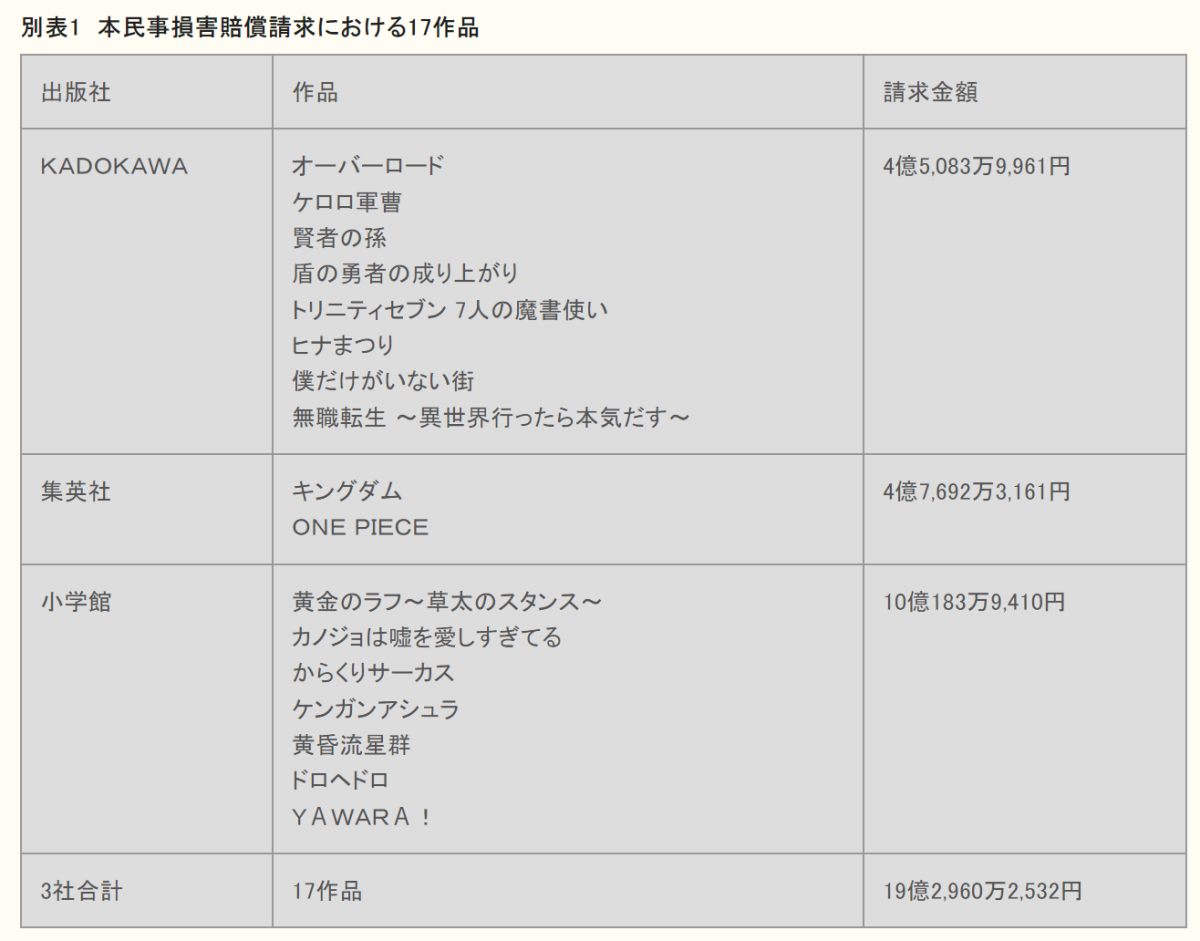 附表提到,針對遭到侵權的 17 部發行作品(角川 8 部、集英社 2 部、小學館 7 部)進行求償。求償金額合計高達 19 億 2960 萬 2532 日幣 (角川 4 億 5083 萬 9961 圓、集英社 4 億 7692 萬 3161 圓 、小學館 10 億 183 萬 9410 圓 )。