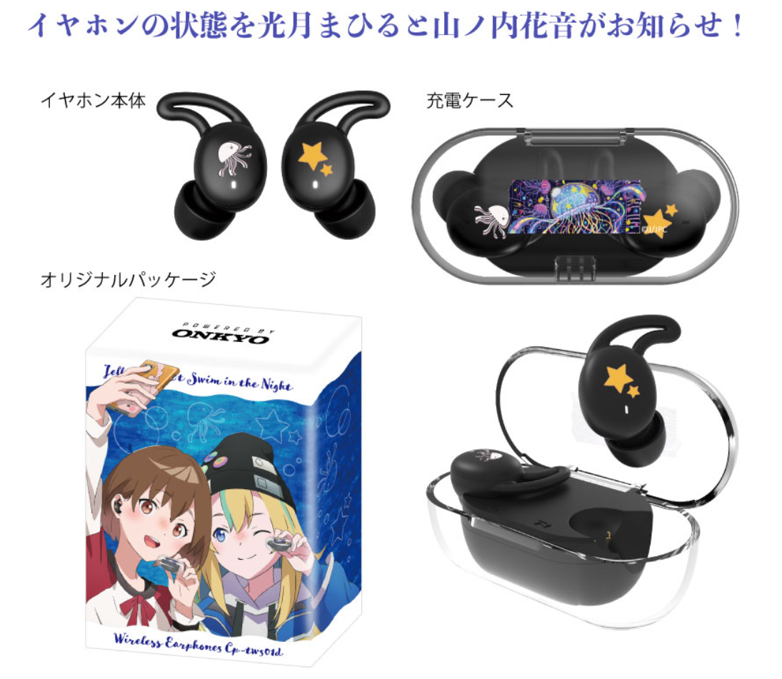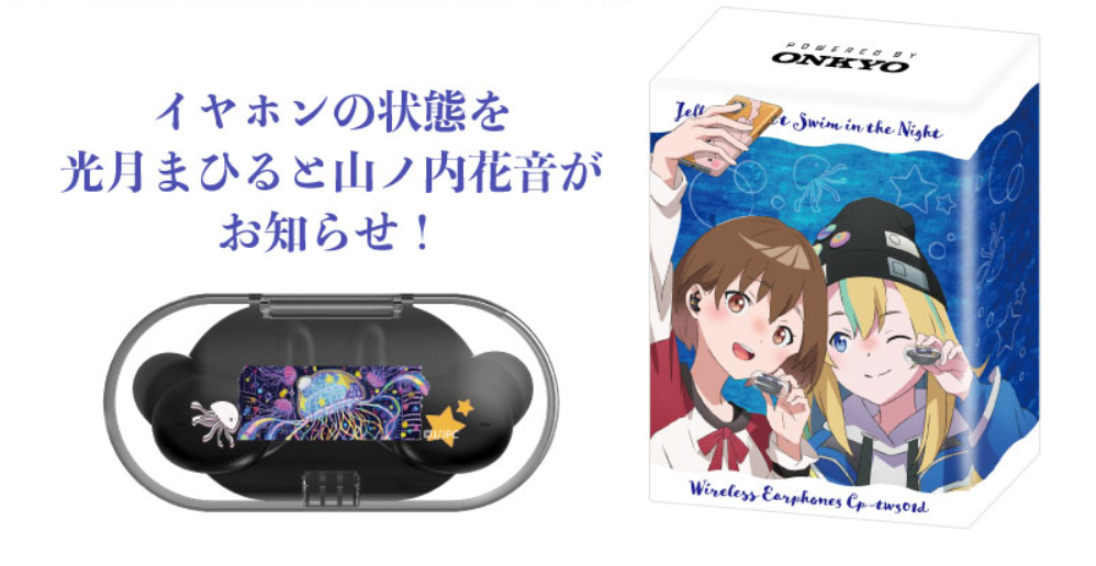 近日宣布與與本季播出,動畫工房建立 50 週年的紀念作品《夜晚的水母不會游泳》(夜のクラゲは泳げない)合作,推出聯名款的真無線藍牙耳機,以兩大主角光月真晝 & 山之內花音為主題設計。售價為 16,000 日圓,於今日 ( 7/31 ) 起可於 ONKYO 官網訂購。