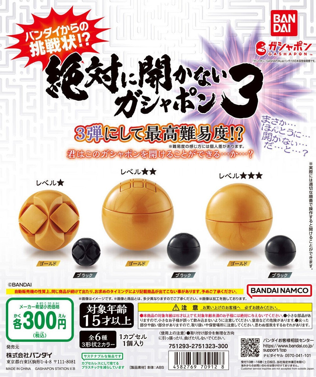 宣稱「絕對打不開!」的轉蛋系列,將轉蛋殼設計成如益智拼圖般複雜的組合,一定要按正確的順序操作才能解開!否則是無法打開的!第三彈「絕對打不開的轉蛋3」難度再升級,同樣分為三種等級與黑色、金級兩種配色,等級★ 光看外觀的設計就覺得有點微妙,等級★★在頂部有神祕的按鍵?另外,等級★★★和前作一樣,外表看似一個單純的扭蛋...可不要小看「越簡單越困難」的設計啦!