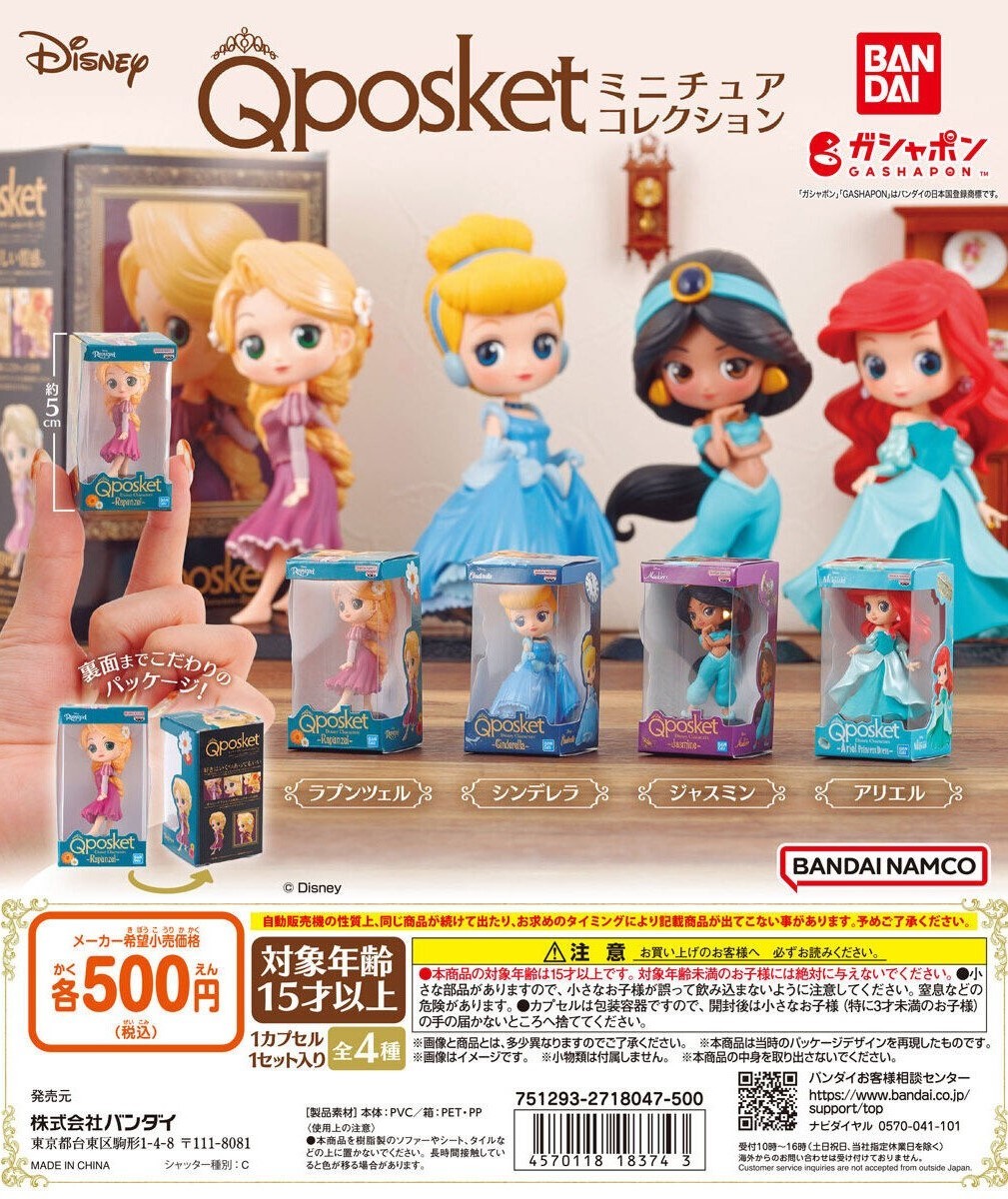 Q posket 人偶景品系列,以高品質 Q(quality)與芬蘭語中的「臉頰」Posket 為設計核心,將角色注入如洋娃娃般可愛的大眼造型。現在以盒裝迷你模型的形式首次在轉蛋機上發售!『Disney Q posket 迷你收藏』轉蛋將精緻的造型調整為 5 公分的小尺寸,首波收錄有系列最受歡迎的迪士尼公主:長髮公主、灰姑娘、茉莉公主、愛麗兒四款角色,並以實際包裝為基礎,忠實再現了Q posket 的細節與品質!